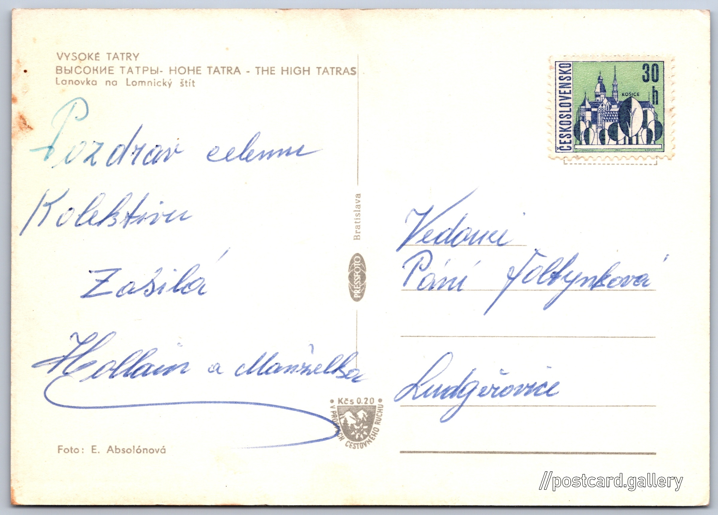 Vysoké Tatry, lanovka na Lomnický štít 9/80 Pokud chcete vidět pohlednice ve vyšším rozlišení nebo zobrazovat jejich zadní stranu, tak se prosím nejdříve přihlašte Přihlásit Zaregistrovat VYSOKÉ TATRYВЫСОКИЕ ТАТРЫ - НОНЕ TATRA - THE HIGH TATRASLanovka na Lomnický štít Jazyk tištěného textu na pohlednici: slovenština Tatranská Lomnica ukázat na mapě V blízkém okolí místa zobrazeného na pohlednici lze najít 97 jiných pohlednic. Zobrazit blízké pohlednice Vydavatel: PressFoto Bratislava (Československo) Datum vydání není známo Pomozte nám odhadnout datum vzniku pohlednice Velikost (š x v) a tvar pohlednice: 148 x 105 mm (5.83" x 4.13"), obdélník Osoby spjaté s touto pohlednicí: Eva Absolonová(Autor fotografie) Prošlá poštou Ceny: Příplatek na tur. ruch: 0,20 Kčs (CSK))Vyplacené známky: 0,30 Kčs (CSK) DiskuseVložit příspěvek Přidat novou složku ... Spravovat složky ...
