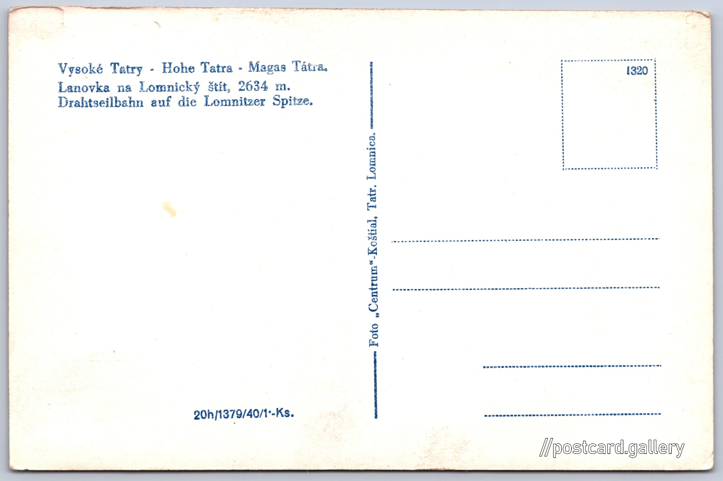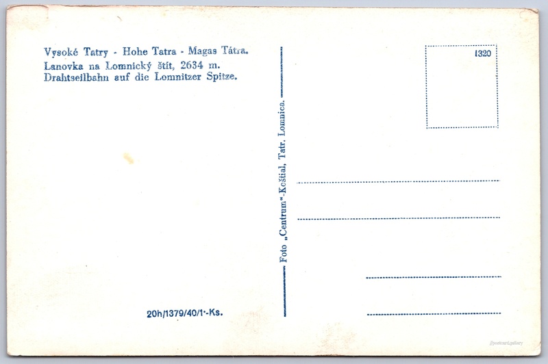 Vysoké Tatry, lanovka na Lomnický štít Pokud chcete vidět pohlednice ve vyšším rozlišení nebo zobrazovat jejich zadní stranu, tak se prosím nejdříve přihlašte Přihlásit Zaregistrovat Vysoké Tatry - Hohe Tatra - Magas Tátra.Lanovka na Lomnický štít, 2634 m.Drahtseilbahn auf die Lomnitzer Spitze. Jazyky tištěného textu na pohlednici: slovenština, němčina, maďarština Tatranská Lomnica ukázat na mapě V blízkém okolí místa zobrazeného na pohlednici lze najít 140 jiných pohlednic. Zobrazit blízké pohlednice Vydavatel: Foto Centrum Koštial (Československo) Datum vydání není známo Pomozte nám odhadnout datum vzniku pohlednice Velikost (š x v) a tvar pohlednice: 141 x 93 mm (5.55" x 3.66"), obdélník Čistá pohlednice (neprošlá poštou) Ceny: Cena pohlednice: 1,00 Kčs (CSK) (+0,20 Kčs přípl. na tur. ruch) Kódy na pohlednici: 1320 1379/40 DiskuseVložit příspěvek Přidat novou složku ... Spravovat složky ...