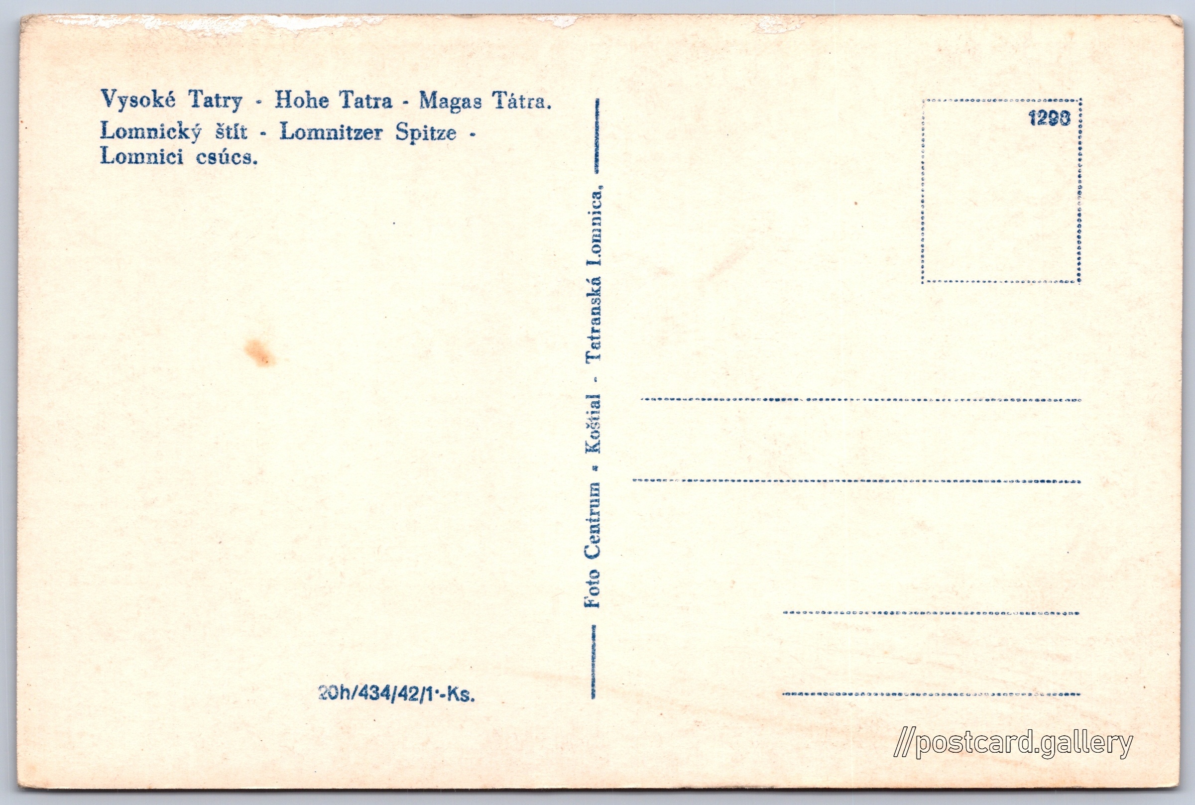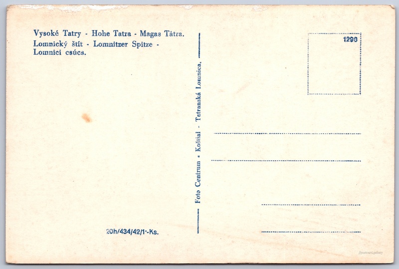 Vysoké Tatry, Lomnický štít Pokud chcete vidět pohlednice ve vyšším rozlišení nebo zobrazovat jejich zadní stranu, tak se prosím nejdříve přihlašte Přihlásit Zaregistrovat Vysoké Tatry - Hohe Tatra - Magas Tátra.Lomnický štít - Lomnitzer Spitze - Lomnici csúcs. Jazyky tištěného textu na pohlednici: slovenština, němčina, maďarština Lomnický štít (2634 m), Hora, výškový bod, Vysoké Tatry - Tatranská Lomnica, Slovensko ukázat na mapě V blízkém okolí místa zobrazeného na pohlednici lze najít 135 jiných pohlednic. Zobrazit blízké pohlednice Vydavatel: Foto Centrum Koštial (Československo) Datum vydání není známo Pomozte nám odhadnout datum vzniku pohlednice Velikost (š x v) a tvar pohlednice: 139 x 93 mm (5.47" x 3.66"), obdélník Čistá pohlednice (neprošlá poštou) Ceny: Cena pohlednice: 1,00 Kčs (CSK) (+0,20 Kčs přípl. na tur. ruch) Kódy na pohlednici: 1298 434/42 DiskuseVložit příspěvek Přidat novou složku ... Spravovat složky ...