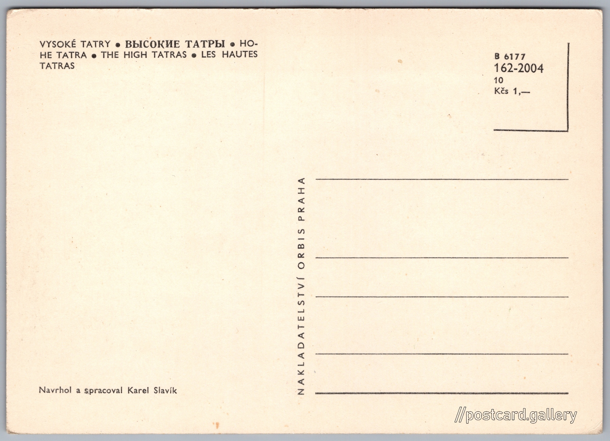 Vysoké Tatry, mapa Pokud chcete vidět pohlednice ve vyšším rozlišení nebo zobrazovat jejich zadní stranu, tak se prosím nejdříve přihlašte Přihlásit Zaregistrovat VYSOKÉ TATRY - ВЫСОКИЕ ТАТРЫ - HOHE TATRA - THE HIGH TATRAS - LES HAUTES TATRAS Jazyk tištěného textu na pohlednici: francouzština 55C7+VH Vysoké Tatry, Slovakia ukázat na mapě V blízkém okolí místa zobrazeného na pohlednici lze najít 127 jiných pohlednic. Zobrazit blízké pohlednice Vydavatel: Nakladatelství Orbis (Československo) Datum vydání není známo Pomozte nám odhadnout datum vzniku pohlednice Velikost (š x v) a tvar pohlednice: 149 x 106 mm (5.87" x 4.17"), obdélník Osoby spjaté s touto pohlednicí: Karel Slavík(Design pohlednice) Čistá pohlednice (neprošlá poštou) Ceny: Cena pohlednice: 1,00 Kčs (CSK) Kódy na pohlednici: B 6177 162-2004 10 DiskuseVložit příspěvek Přidat novou složku ... Spravovat složky ...
