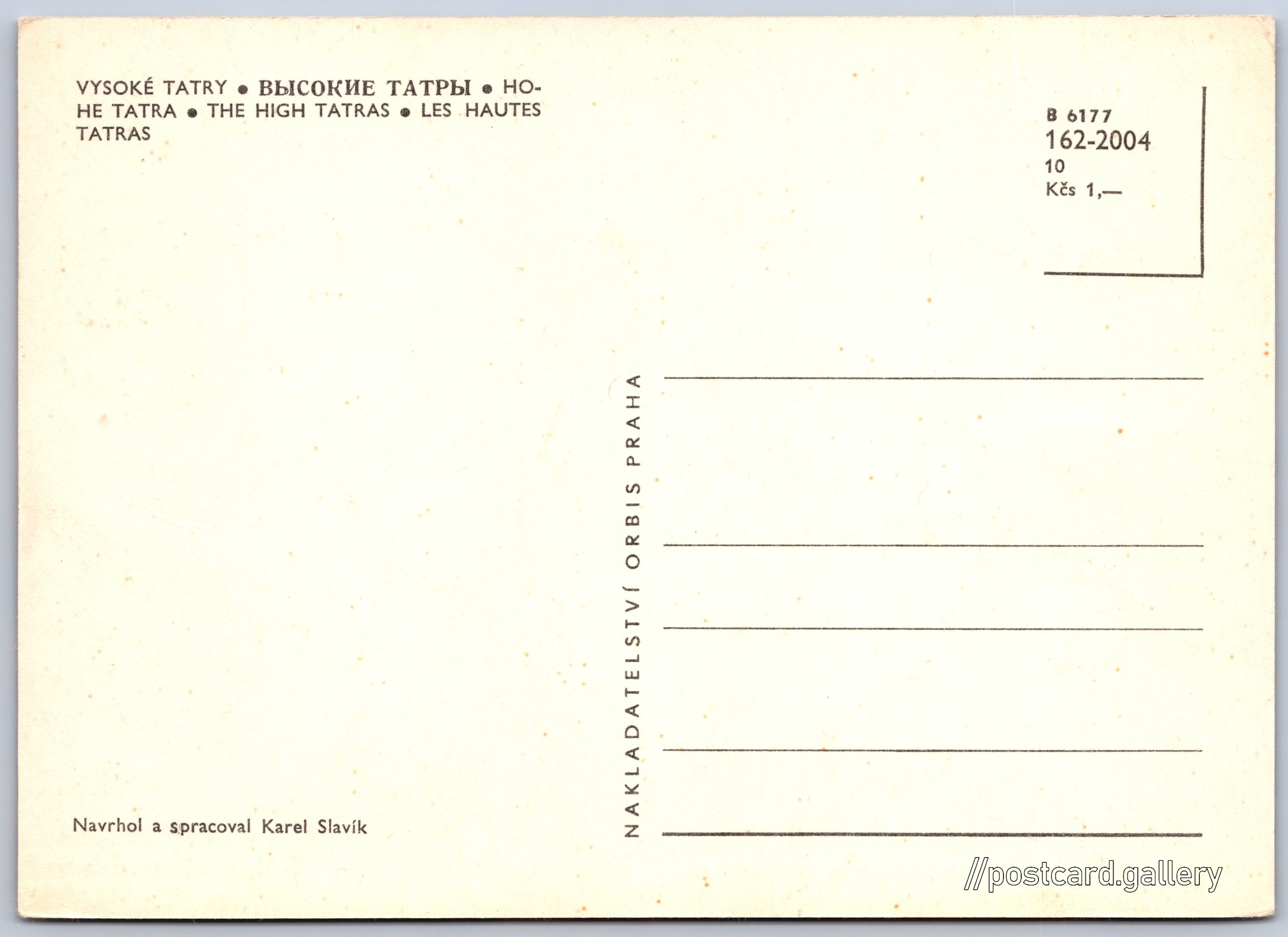 Vysoké Tatry, mapa Pokud chcete vidět pohlednice ve vyšším rozlišení nebo zobrazovat jejich zadní stranu, tak se prosím nejdříve přihlašte Přihlásit Zaregistrovat Vysoké Tatry VYSOKÉ TATRY - ВЫСОКИЕ ТАТРЫ - НОHE TATRA - THE HIGH TATRAS - LES HAUTES TATRASNavrhol a spracoval Karel Slavík Jazyk tištěného textu na pohlednici: angličtina 55C7+VH Vysoké Tatry, Slovakia ukázat na mapě V blízkém okolí místa zobrazeného na pohlednici lze najít 127 jiných pohlednic. Zobrazit blízké pohlednice Vydavatel: Nakladatelství Orbis (Československo) Datum vydání není známo Pomozte nám odhadnout datum vzniku pohlednice Velikost (š x v) a tvar pohlednice: 147 x 105 mm (5.79" x 4.13"), obdélník Osoby spjaté s touto pohlednicí: Karel Slavík(Design pohlednice) Čistá pohlednice (neprošlá poštou) Ceny: Cena pohlednice: 1,00 Kčs (CSK) Kódy na pohlednici: B 6177 162-2004 10 DiskuseVložit příspěvek Přidat novou složku ... Spravovat složky ...