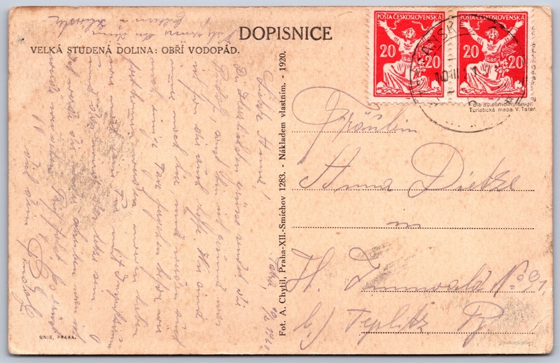 Vysoké Tatry, Obří vodopád Pokud chcete vidět pohlednice ve vyšším rozlišení nebo zobrazovat jejich zadní stranu, tak se prosím nejdříve přihlašte Přihlásit Zaregistrovat VELKÁ STUDENÁ DOLINA: OBŘÍ VODOPÁD.DOPISNICEFot. A. Chytil, Praha-XII.-Smíchov. 1283. Nákladem vlastním. - 1920. Jazyk tištěného textu na pohlednici: čeština Tatranská Lomnica ukázat na mapě V blízkém okolí místa zobrazeného na pohlednici lze najít 160 jiných pohlednic. Zobrazit blízké pohlednice Vydavatel: UNIE Praha (Československo)Fot. A. Chytil (Československo) Rok vydání pohlednice: 1920 Velikost (š x v) a tvar pohlednice: 141 x 90 mm (5.55" x 3.54"), obdélník Prošlá poštou:Datum na razítku: 10.3.1921Datum napsání pohledu: 10.2.1921 Ceny: Vyplacené známky: 0,40 Kčs (CSK) Kódy na pohlednici: 1283 DiskuseVložit příspěvek Přidat novou složku ... Spravovat složky ...