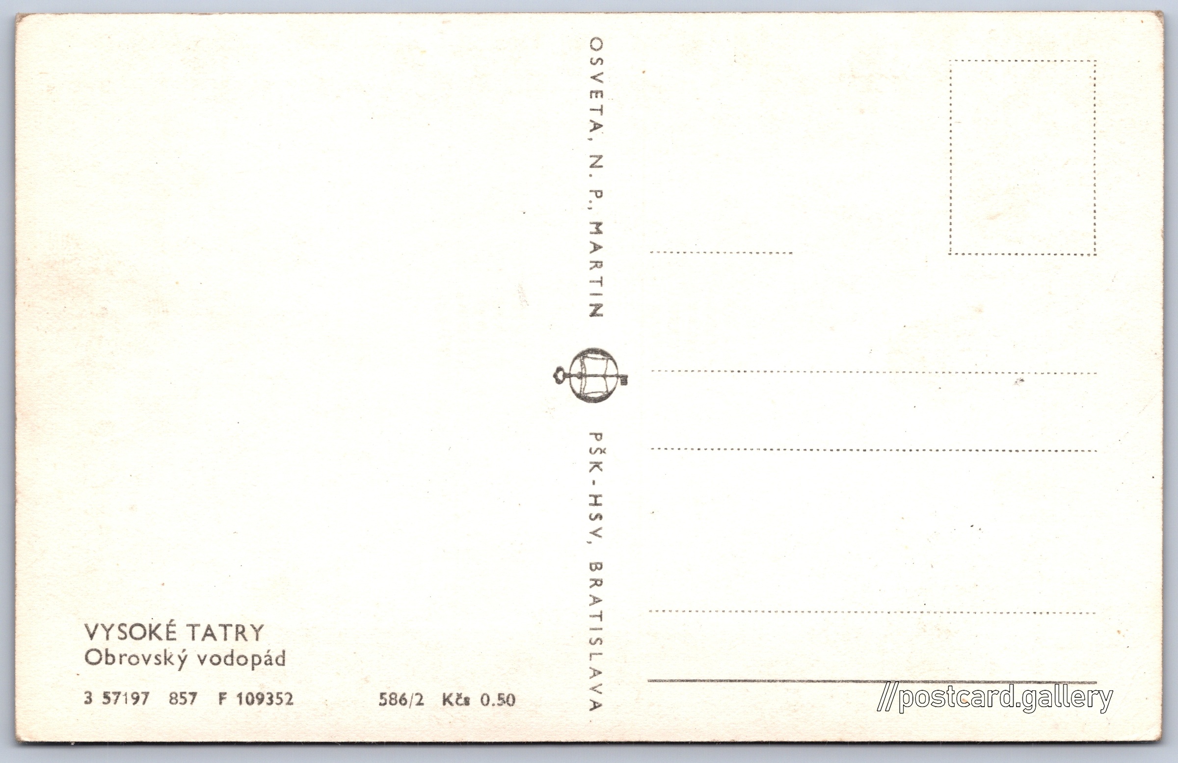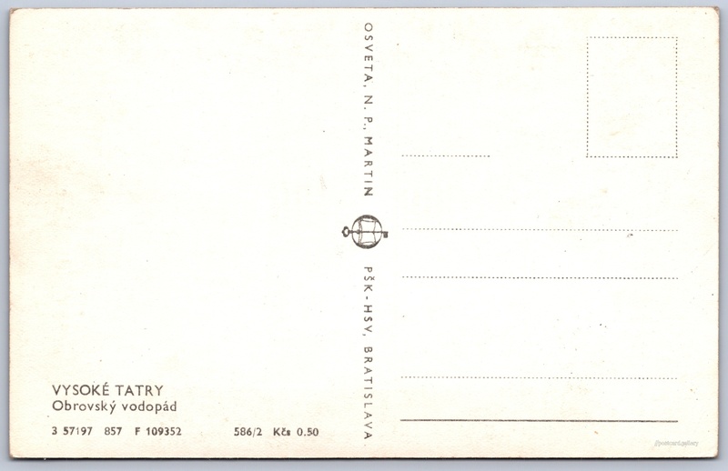 Vysoké Tatry, Obrovský vodopád Pokud chcete vidět pohlednice ve vyšším rozlišení nebo zobrazovat jejich zadní stranu, tak se prosím nejdříve přihlašte Přihlásit Zaregistrovat VYSOKÉ TATRYObrovský vodopád Jazyk tištěného textu na pohlednici: slovenština Obrovský vodopád, Vodopád, Vysoké Tatry - Tatranská Lomnica, Slovensko ukázat na mapě V blízkém okolí místa zobrazeného na pohlednici lze najít 160 jiných pohlednic. Zobrazit blízké pohlednice Vydavatel: Osveta, n. p., Martin PŠK - Bratislava (Československo) Rok vydání pohlednice: srpen, 1957 Velikost (š x v) a tvar pohlednice: 138 x 87 mm (5.43" x 3.43"), obdélník Čistá pohlednice (neprošlá poštou) Ceny: Cena pohlednice: 0,50 Kčs (CSK) Kódy na pohlednici: 3 57197 857 F 109352 586/2 DiskuseVložit příspěvek Přidat novou složku ... Spravovat složky ...