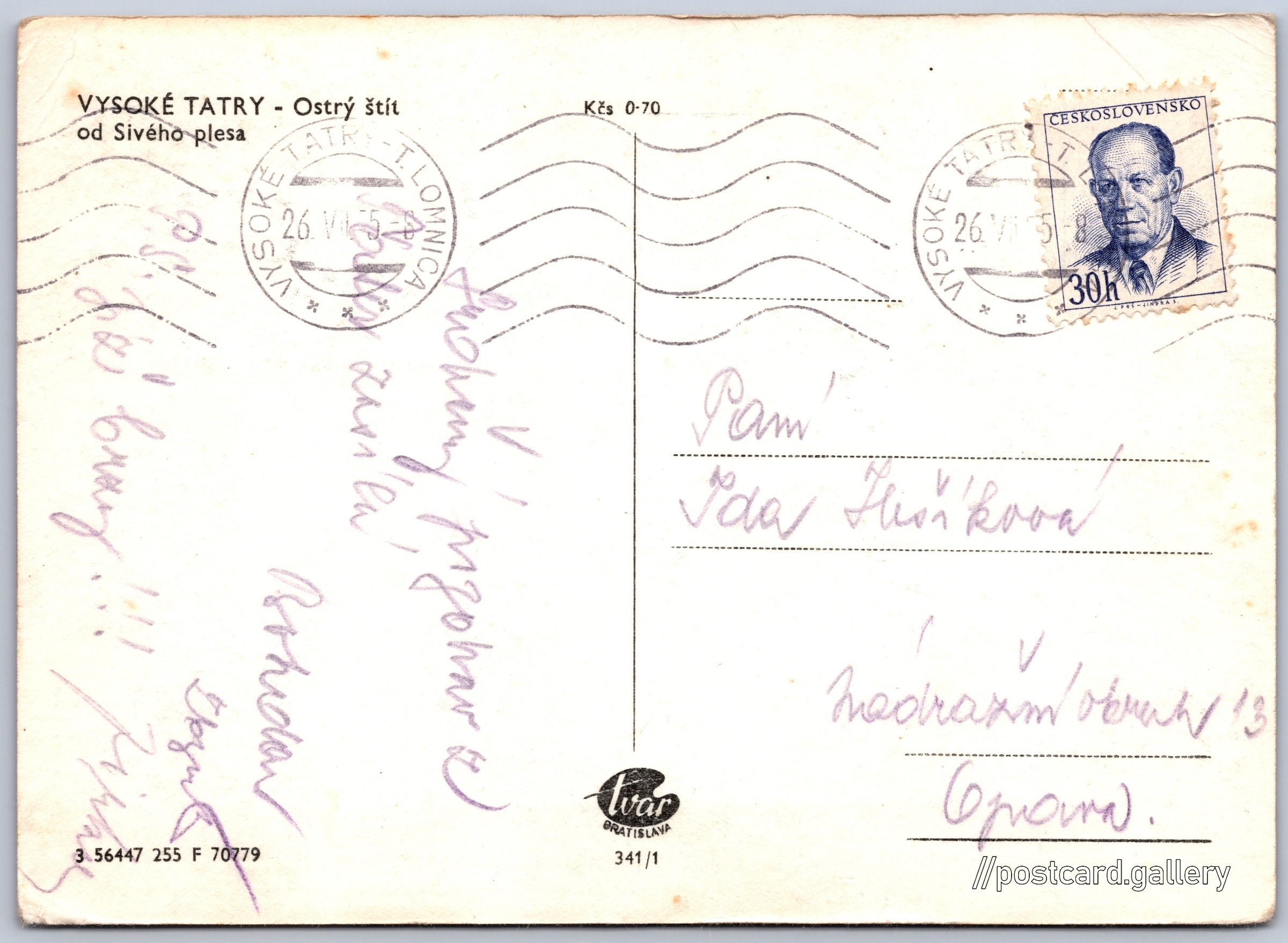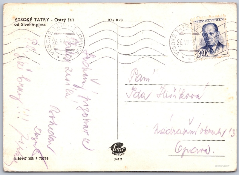 Vysoké Tatry, Ostrý štít Pokud chcete vidět pohlednice ve vyšším rozlišení nebo zobrazovat jejich zadní stranu, tak se prosím nejdříve přihlašte Přihlásit Zaregistrovat VYSOKÉ TATRY - Ostrý štít od Sivého plesa Jazyk tištěného textu na pohlednici: čeština Ostrý štít (2360 m), Hora, výškový bod, Tatranská Javorina, Slovensko ukázat na mapě V blízkém okolí místa zobrazeného na pohlednici lze najít 141 jiných pohlednic. Zobrazit blízké pohlednice Vydavatel: Tvar Bratislava (Československo) Rok vydání pohlednice: únor, 1955 Velikost (š x v) a tvar pohlednice: 147 x 106 mm (5.79" x 4.17"), obdélník Prošlá poštou Ceny: Vyplacené známky: 0,30 Kčs (CSK) Kódy na pohlednici: 3 56447 255 F 70779 341/1 DiskuseVložit příspěvek Přidat novou složku ... Spravovat složky ...