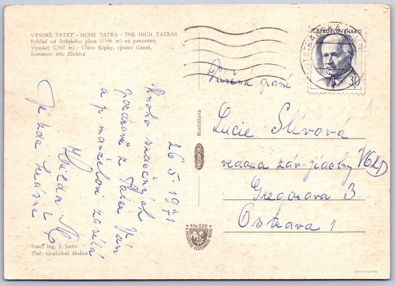 Vysoké Tatry, panoráma Vysoké od Štrbského plesa Pokud chcete vidět pohlednice ve vyšším rozlišení nebo zobrazovat jejich zadní stranu, tak se prosím nejdříve přihlašte Přihlásit Zaregistrovat Vysoké Tatry VYSOKÉ TATRY - HOHE TATRA - THE HIGH TATRASPohľad od Štrbského plesa (1346 m) na panorámu Vysokej (2560 m) Vľavo Kôpky, vpravo Ganek, Rumanov štít, Zlobivá Jazyk tištěného textu na pohlednici: slovenština Štrbské pleso, Vodní plocha, Štrba, Slovensko ukázat na mapě V blízkém okolí místa zobrazeného na pohlednici lze najít 133 jiných pohlednic. Zobrazit blízké pohlednice Vydavatel: PressFoto Bratislava (Československo) Odhadované datum vydání pohlednice: 1968 - 1971 Pomozte nám zpřesnit rok vzniku pohlednice Velikost (š x v) a tvar pohlednice: 148 x 105 mm (5.83" x 4.13"), obdélník Osoby spjaté s touto pohlednicí: Ing. J. Jurčo(Autor fotografie) Prošlá poštou:Datum na razítku: 26.5.1971Datum napsání pohledu: 26.5.1971 Ceny: Příplatek na tur. ruch: 0,20 Kčs (CSK))Vyplacené známky: 0,30 Kčs (CSK) DiskuseVložit příspěvek Přidat novou složku ... Spravovat složky ...