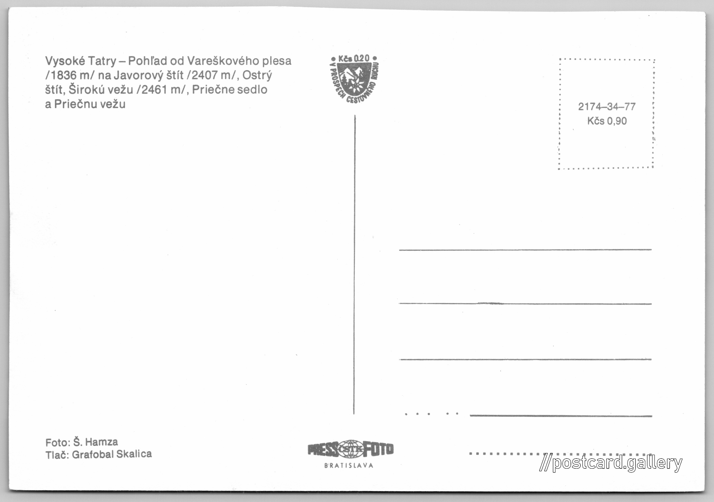Vysoké Tatry, pohled od Vareškového plesa Pokud chcete vidět pohlednice ve vyšším rozlišení nebo zobrazovat jejich zadní stranu, tak se prosím nejdříve přihlašte Přihlásit Zaregistrovat Vysoké Tatry Vysoké Tatry - Pohľad od Vareškového plesa /1836 m/ na Javorový štít /2407 m/, Ostrý štít, Širokú vežu /2461 m/, Priečne sedlo a Priečnu vežu Jazyk tištěného textu na pohlednici: slovenština Vareškové pleso, Vodní plocha, Vysoké Tatry - Tatranská Lomnica, Slovensko ukázat na mapě V blízkém okolí místa zobrazeného na pohlednici lze najít 153 jiných pohlednic. Zobrazit blízké pohlednice Vydavatel: PressFoto Bratislava (Československo) Datum vydání není známo Pomozte nám odhadnout datum vzniku pohlednice Velikost (š x v) a tvar pohlednice: 148 x 102 mm (5.83" x 4.02"), obdélník Osoby spjaté s touto pohlednicí: Štefan Hamza(Autor fotografie) Čistá pohlednice (neprošlá poštou) Ceny: Cena pohlednice: 0,90 Kčs (CSK) (+0,20 Kčs přípl. na tur. ruch) Kódy na pohlednici: 2174-34-77 DiskuseVložit příspěvek Přidat novou složku ... Spravovat složky ...