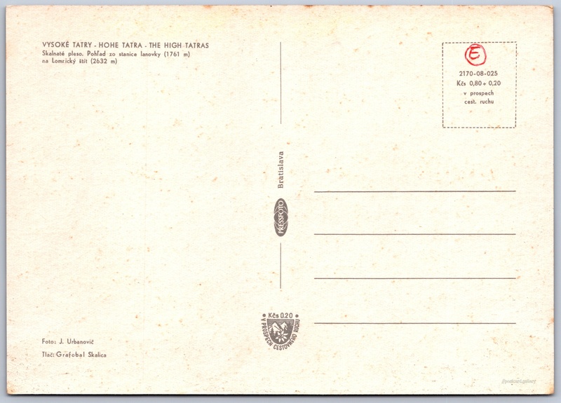 Vysoké Tatry, pohled ze stanice lanovky na Lomnický štít Pokud chcete vidět pohlednice ve vyšším rozlišení nebo zobrazovat jejich zadní stranu, tak se prosím nejdříve přihlašte Přihlásit Zaregistrovat VYSOKÉ TATRY - HOHE TATRA THE HIGH TATRASSkalnaté pleso. Pohľad zo stanice lanovky (1761 m) na Lomrický štít (2632 m) Jazyk tištěného textu na pohlednici: slovenština Tatranská Lomnica 14004 ukázat na mapě V blízkém okolí místa zobrazeného na pohlednici lze najít 150 jiných pohlednic. Zobrazit blízké pohlednice Vydavatel: PressFoto Bratislava (Československo) Datum vydání není známo Pomozte nám odhadnout datum vzniku pohlednice Velikost (š x v) a tvar pohlednice: 148 x 105 mm (5.83" x 4.13"), obdélník Osoby spjaté s touto pohlednicí: J. Urbanovič(Autor fotografie) Čistá pohlednice (neprošlá poštou) Ceny: Cena pohlednice: 0,80 Kčs (CSK) (+0,20 Kčs přípl. na tur. ruch) Kódy na pohlednici: 2170-08-025 DiskuseVložit příspěvek Přidat novou složku ... Spravovat složky ...