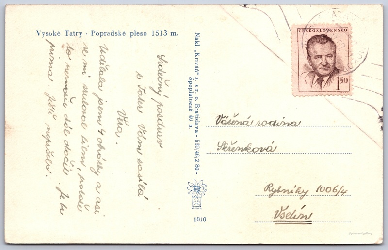 Vysoké Tatry, Popradské pleso Pokud chcete vidět pohlednice ve vyšším rozlišení nebo zobrazovat jejich zadní stranu, tak se prosím nejdříve přihlašte Přihlásit Zaregistrovat Vysoké Tatry Popradské pleso 1513 m. Jazyk tištěného textu na pohlednici: slovenština Popradské pleso, Vodní plocha, Vysoké Tatry - Štrbské Pleso, Slovensko ukázat na mapě V blízkém okolí místa zobrazeného na pohlednici lze najít 112 jiných pohlednic. Zobrazit blízké pohlednice Vydavatel: Kriváň (Československo) Odhadované datum vydání pohlednice: 1949 - 1952 Pomozte nám zpřesnit rok vzniku pohlednice Velikost (š x v) a tvar pohlednice: 140 x 89 mm (5.51" x 3.50"), obdélník Prošlá poštou:Datum na razítku: 19.5.1952 Ceny: Cena pohlednice: 2,80 Kčs (CSK) (+0,40 Kčs přípl. na tur. ruch)Vyplacené známky: 1,50 Kčs (CSK) Kódy na pohlednici: 539/46 1816 DiskuseVložit příspěvek Přidat novou složku ... Spravovat složky ...