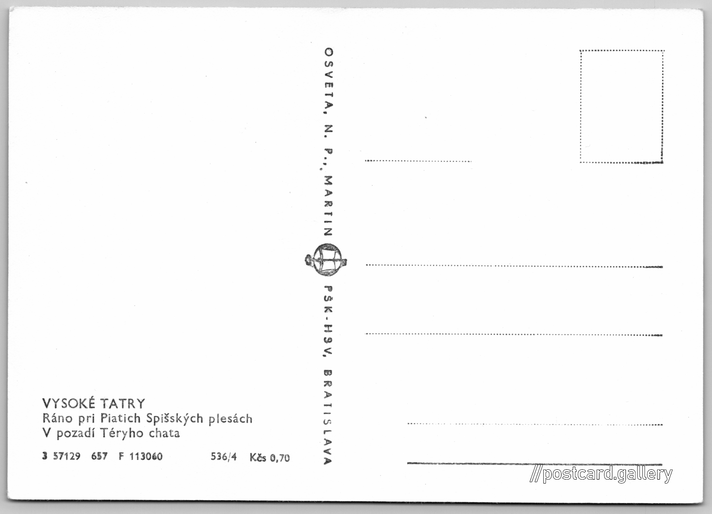 Vysoké Tatry, ráno u pěti Spišských ples Pokud chcete vidět pohlednice ve vyšším rozlišení nebo zobrazovat jejich zadní stranu, tak se prosím nejdříve přihlašte Přihlásit Zaregistrovat VYSOKÉ TATRYRáno pri Piatich Spišských plesáchV pozadí Téryho chata Jazyk tištěného textu na pohlednici: slovenština Tatranská Lomnica ukázat na mapě V blízkém okolí místa zobrazeného na pohlednici lze najít 140 jiných pohlednic. Zobrazit blízké pohlednice Vydavatel: Osveta, n. p., Martin PŠK - Bratislava (Československo) Rok vydání pohlednice: červen, 1957 Velikost (š x v) a tvar pohlednice: 147 x 104 mm (5.79" x 4.09"), obdélník Čistá pohlednice (neprošlá poštou) Ceny: Cena pohlednice: 0,70 Kčs (CSK) Kódy na pohlednici: 3 57129 657 F 113060 536/4 DiskuseVložit příspěvek Přidat novou složku ... Spravovat složky ...