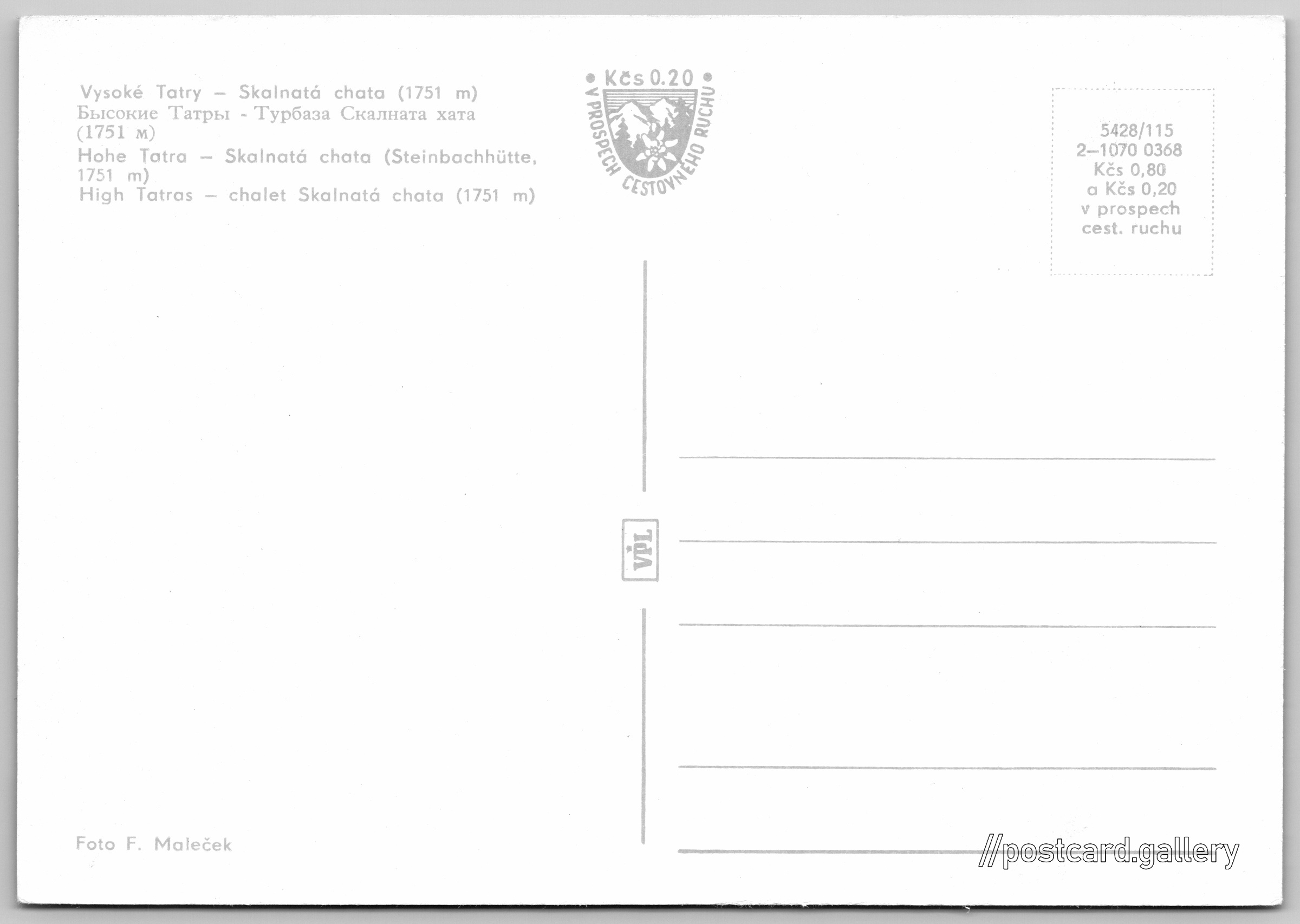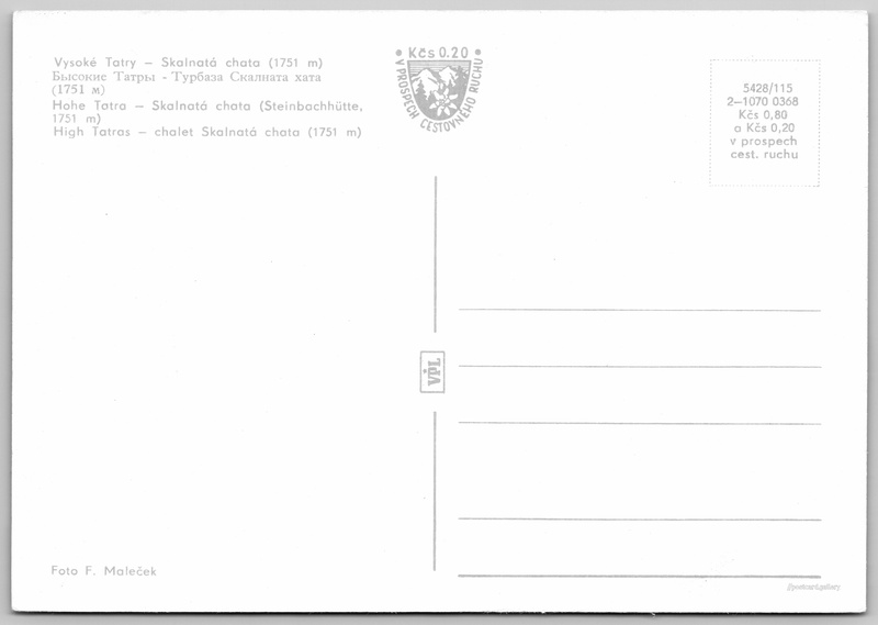 Vysoké Tatry, Skalnatá chata 7/151 Pokud chcete vidět pohlednice ve vyšším rozlišení nebo zobrazovat jejich zadní stranu, tak se prosím nejdříve přihlašte Přihlásit Zaregistrovat Vysoké Tatry - Skalnatá chata (1751 m)Бысокие Татры - Турбаза Скалната хата (1751 M)Hohe Tatra - Skalnatá chata (Steinbachhütte, 1751 m)High Tatras - chalet Skalnatá chata (1751 m) Jazyk tištěného textu na pohlednici: čeština Skalnatá chata, Chata, bouda, Tatranská Lomnica 14577, Vysoké Tatry - Tatranská Lomnica, Slovensko ukázat na mapě V blízkém okolí místa zobrazeného na pohlednici lze najít 140 jiných pohlednic. Zobrazit blízké pohlednice Vydavatel: VPL (Československo) Datum vydání není známo Pomozte nám odhadnout datum vzniku pohlednice Velikost (š x v) a tvar pohlednice: 148 x 104 mm (5.83" x 4.09"), obdélník Osoby spjaté s touto pohlednicí: František Maleček(Autor fotografie) Čistá pohlednice (neprošlá poštou) Ceny: Cena pohlednice: 0,80 Kčs (CSK) (+0,20 Kčs přípl. na tur. ruch) Kódy na pohlednici: 5428/115 2-1070 0368 DiskuseVložit příspěvek Přidat novou složku ... Spravovat složky ...