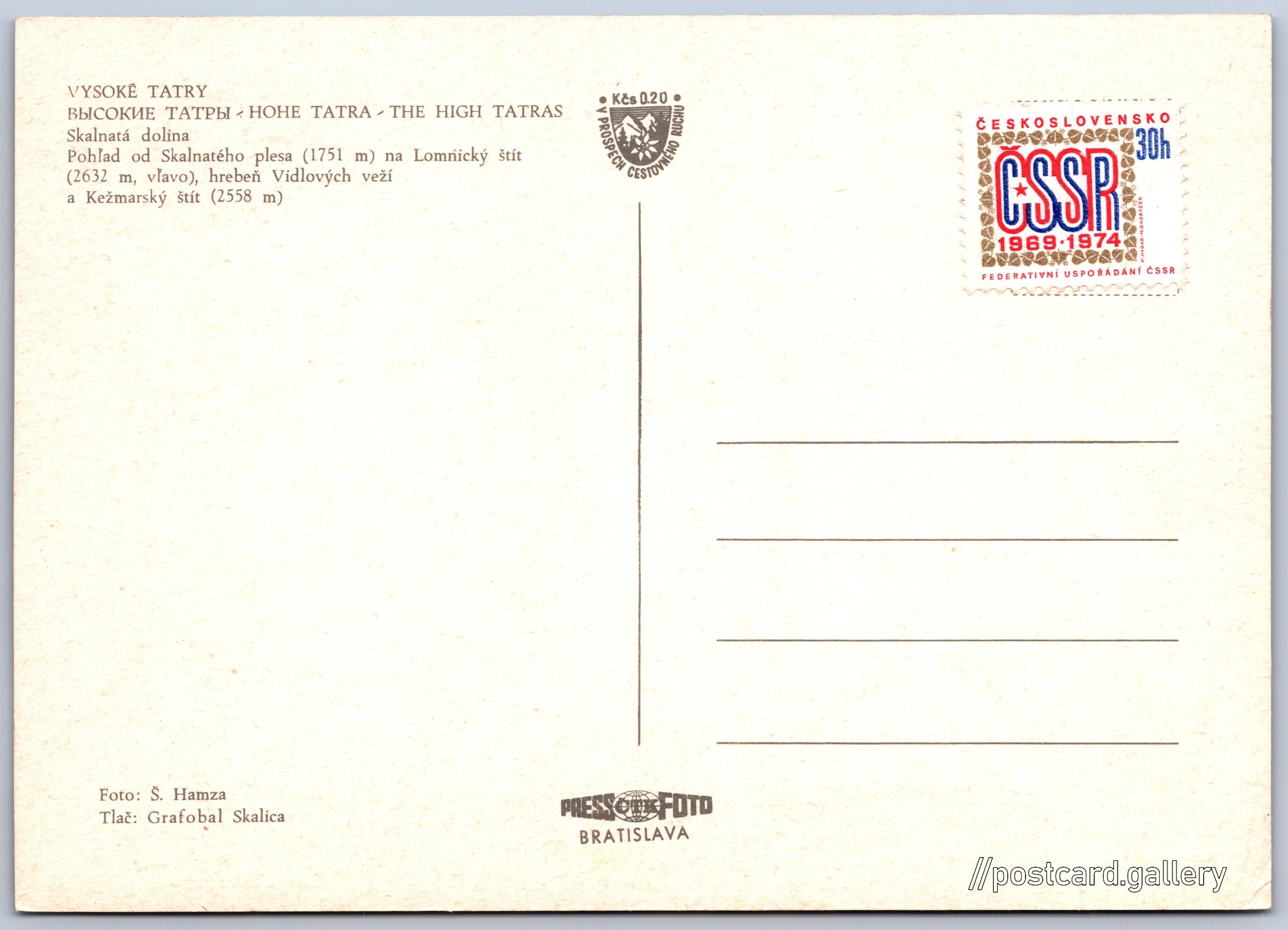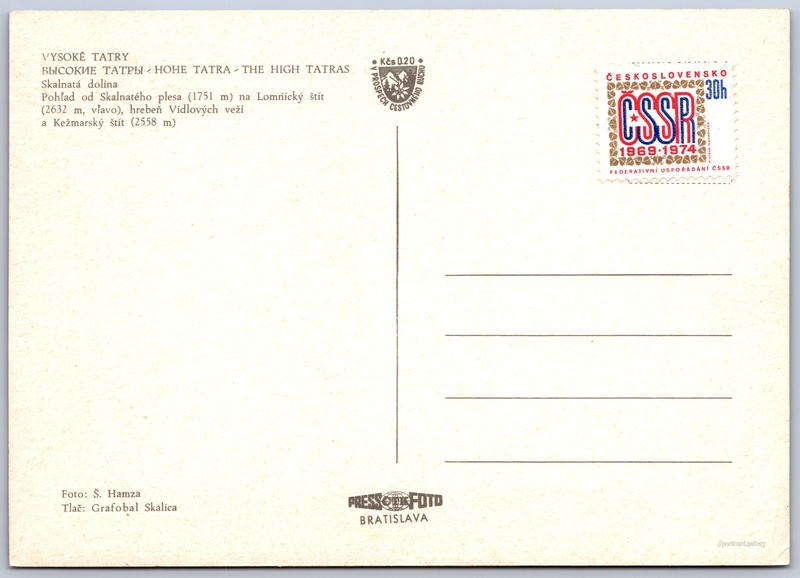 Vysoké Tatry, Skalnatá dolina 5/152 Pokud chcete vidět pohlednice ve vyšším rozlišení nebo zobrazovat jejich zadní stranu, tak se prosím nejdříve přihlašte Přihlásit Zaregistrovat Vysoké Tatry VYSOKÉ TATRYВЫСОКИЕ ТАТРЫ - НOHE TATRA - THE HIGH TATRASSkalnatá dolinaPohľad od Skalnatého plesa (1751 m) na Lomnický štít (2632 m, vľavo), hrebeň Vidlových veží a Kežmarský štít (2558 m) Jazyk tištěného textu na pohlednici: slovenština Skalnatá dolina, Kaňon, rokle, soutěska, údolí, Vysoké Tatry - Tatranská Lomnica, Slovensko ukázat na mapě V blízkém okolí místa zobrazeného na pohlednici lze najít 151 jiných pohlednic. Zobrazit blízké pohlednice Vydavatel: PressFoto Bratislava (Československo) Datum vydání není známo Pomozte nám odhadnout datum vzniku pohlednice Velikost (š x v) a tvar pohlednice: 148 x 105 mm (5.83" x 4.13"), obdélník Osoby spjaté s touto pohlednicí: Štefan Hamza(Autor fotografie) Čistá pohlednice (neprošlá poštou) Ceny: Příplatek na tur. ruch: 0,20 Kčs (CSK))Vyplacené známky: 0,30 --- (---) DiskuseVložit příspěvek Přidat novou složku ... Spravovat složky ...