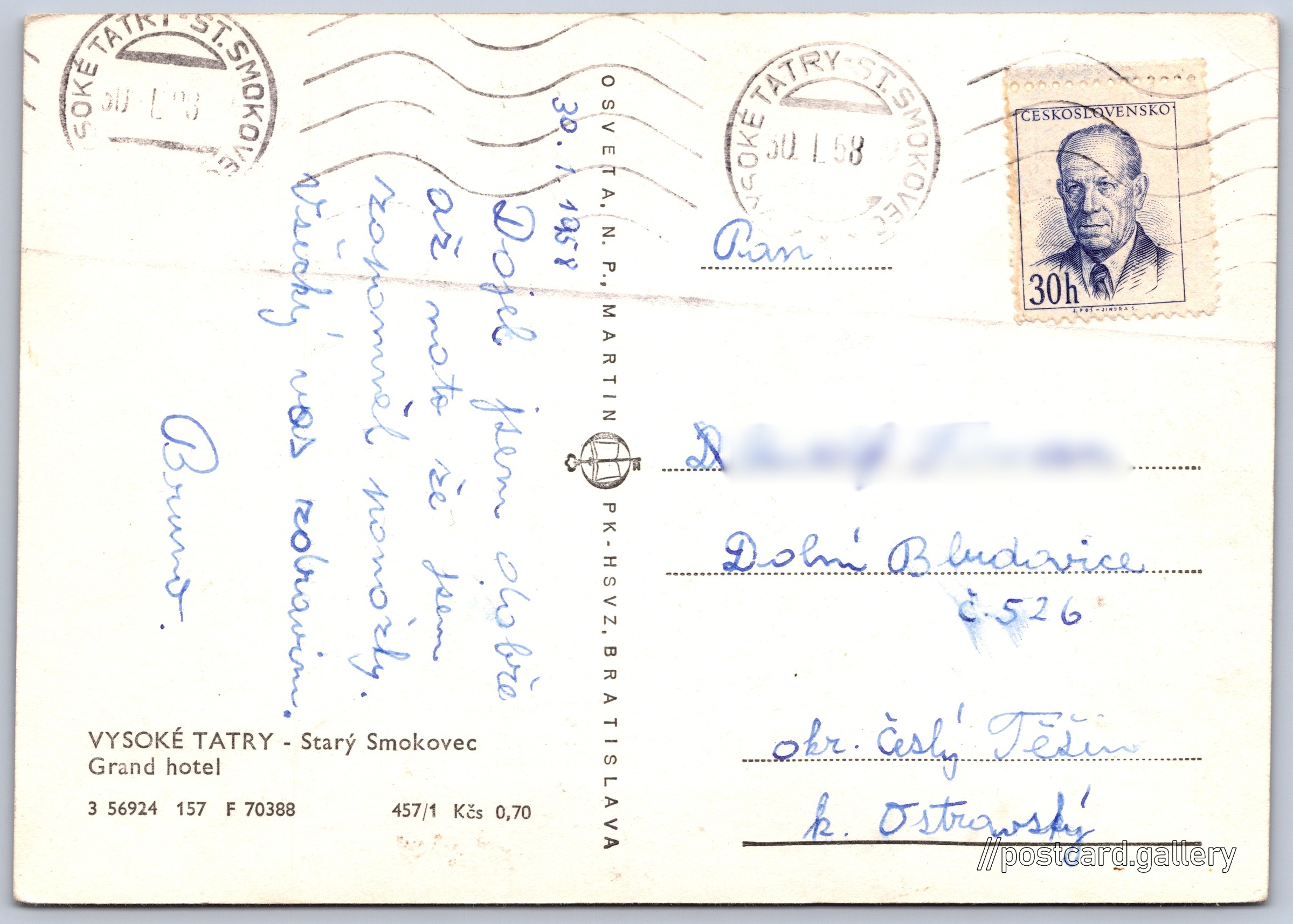Vysoké Tatry, Starý Smokovec, Grand hotel Pokud chcete vidět pohlednice ve vyšším rozlišení nebo zobrazovat jejich zadní stranu, tak se prosím nejdříve přihlašte Přihlásit Zaregistrovat VYSOKÉ TATRY - Starý SmokovecGrand hotel Jazyk tištěného textu na pohlednici: slovenština Grand hotel Starý Smokovec, Stary Smokovec, Vysoké Tatry - Starý Smokovec, Slovensko ukázat na mapě V blízkém okolí místa zobrazeného na pohlednici lze najít 66 jiných pohlednic. Zobrazit blízké pohlednice Vydavatel: Osveta, n. p., Martin PŠK - Bratislava (Československo) Rok vydání pohlednice: leden, 1957 Velikost (š x v) a tvar pohlednice: 148 x 104 mm (5.83" x 4.09"), obdélník Prošlá poštou:Datum na razítku: 30.1.1958Datum napsání pohledu: 30.1.1958 Ceny: Cena pohlednice: 0,70 Kčs (CSK)Vyplacené známky: 0,30 Kčs (CSK) Kódy na pohlednici: 3 56924 157 F 70388 457/1 DiskuseVložit příspěvek Přidat novou složku ... Spravovat složky ...