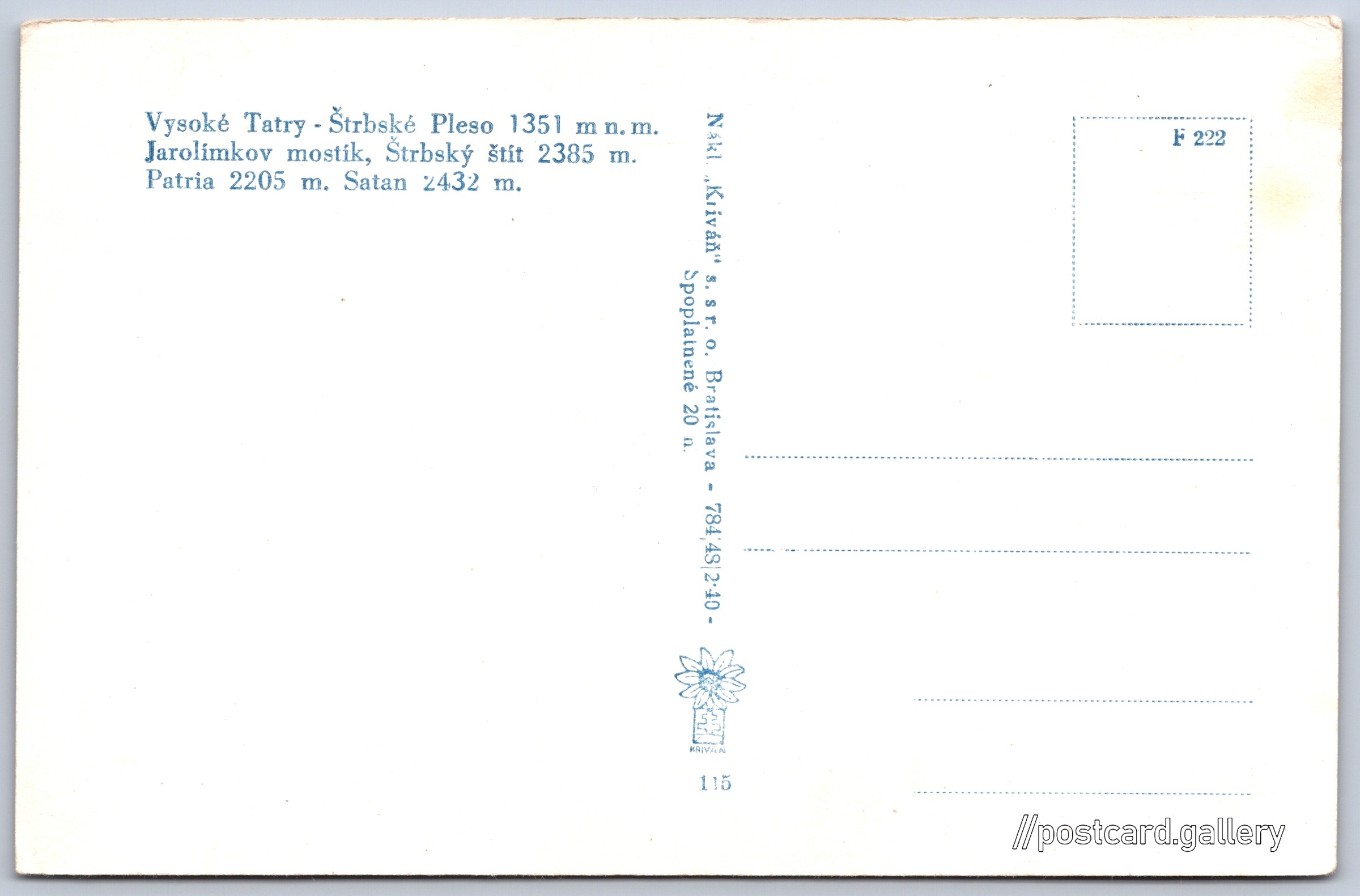 Vysoké Tatry, Štrbské pleso, Jarolímkův můstek Pokud chcete vidět pohlednice ve vyšším rozlišení nebo zobrazovat jejich zadní stranu, tak se prosím nejdříve přihlašte Přihlásit Zaregistrovat Vysoké Tatry - Štrbské Pleso 1351 m n. m.Jarolímkov mostík, Štrbský štít 2385 m.Patria 2205 m. Satan 2432 m. Jazyk tištěného textu na pohlednici: slovenština K vodopádom 4141/60 ukázat na mapě V blízkém okolí místa zobrazeného na pohlednici lze najít 111 jiných pohlednic. Zobrazit blízké pohlednice Vydavatel: Kriváň (Československo) Rok vydání pohlednice: 1948 Velikost (š x v) a tvar pohlednice: 139 x 91 mm (5.47" x 3.58"), obdélník Čistá pohlednice (neprošlá poštou) Ceny: Cena pohlednice: 2,40 Kčs (CSK) (+0,20 Kčs přípl. na tur. ruch) Kódy na pohlednici: 115 784|48 F 222 DiskuseVložit příspěvek Přidat novou složku ... Spravovat složky ...