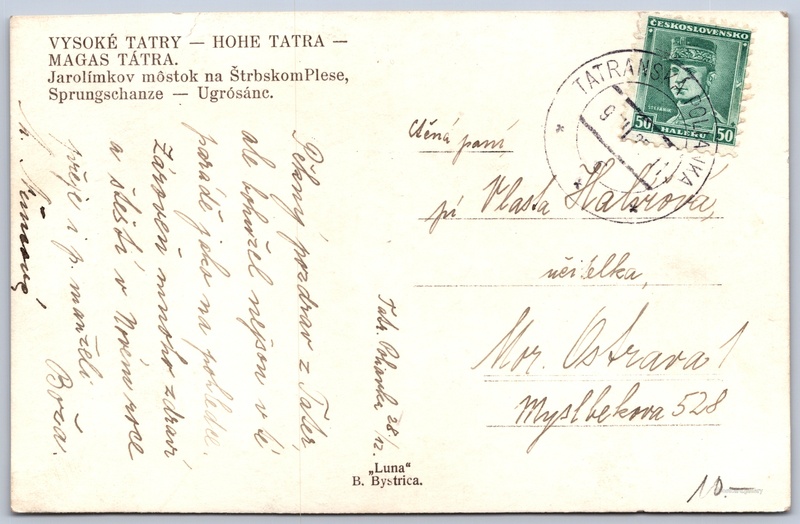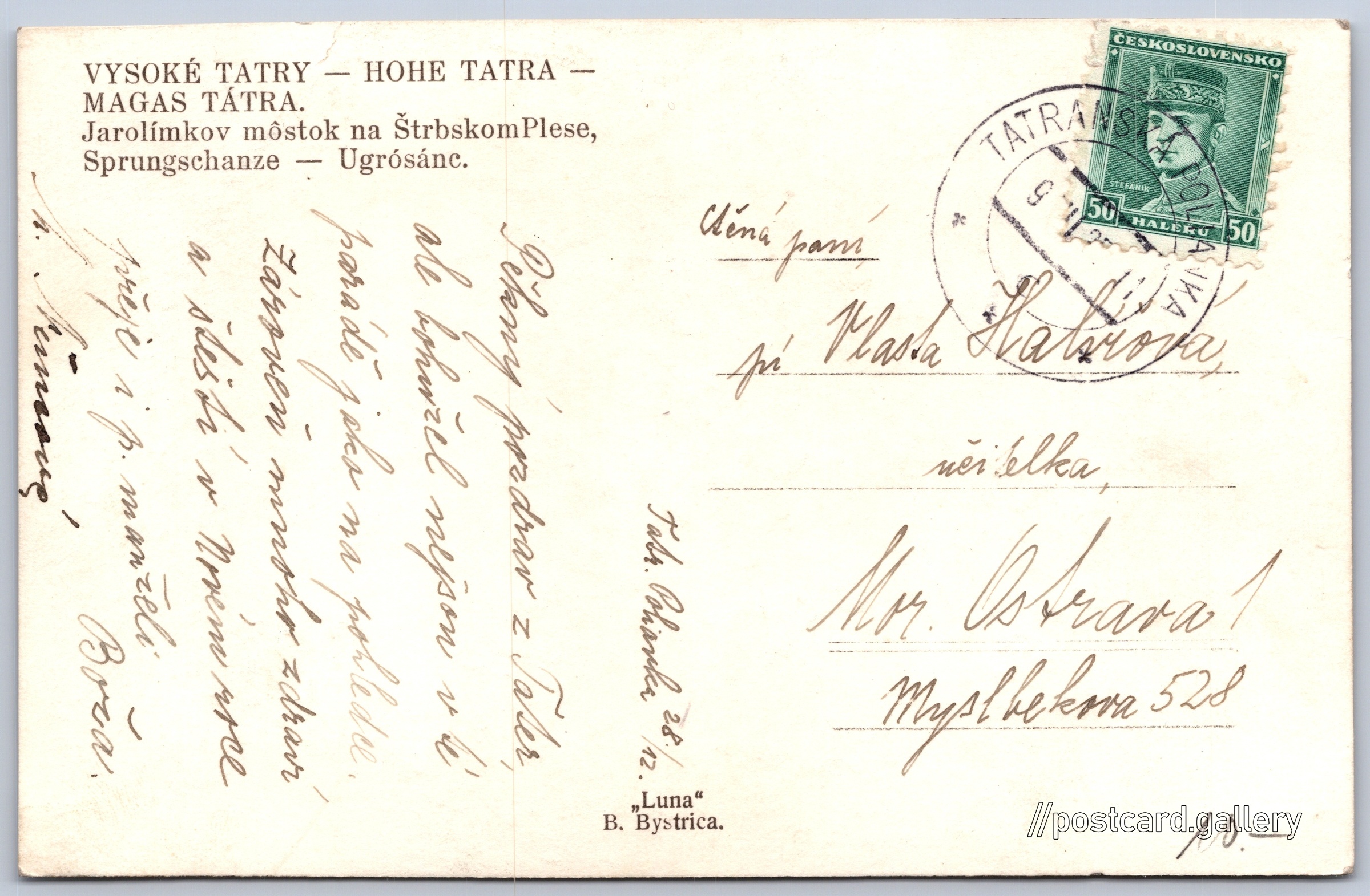 Vysoké Tatry, Štrbské pleso, Jarolímkův můstek 2/82 Pokud chcete vidět pohlednice ve vyšším rozlišení nebo zobrazovat jejich zadní stranu, tak se prosím nejdříve přihlašte Přihlásit Zaregistrovat VYSOKÉ TATRY - HOHE TATRA - MAGAS TÁTRA.Jarolímkov môstok na Štrbskom Plese,Sprungschanze - Ugrósánc. Jazyky tištěného textu na pohlednici: slovenština, němčina, maďarština Štrba - Štrbské pleso ukázat na mapě V blízkém okolí místa zobrazeného na pohlednici lze najít 82 jiných pohlednic. Zobrazit blízké pohlednice Vydavatel: Luna B. B. (Československo) Datum vydání není známo Pomozte nám odhadnout datum vzniku pohlednice Velikost (š x v) a tvar pohlednice: 140 x 90 mm (5.51" x 3.54"), obdélník Osoby spjaté s touto pohlednicí: Karel Jarolímek(Obsah pohlednice) Prošlá poštou Ceny: Vyplacené známky: 0,50 Kčs (CSK) DiskuseVložit příspěvek Přidat novou složku ... Spravovat složky ...