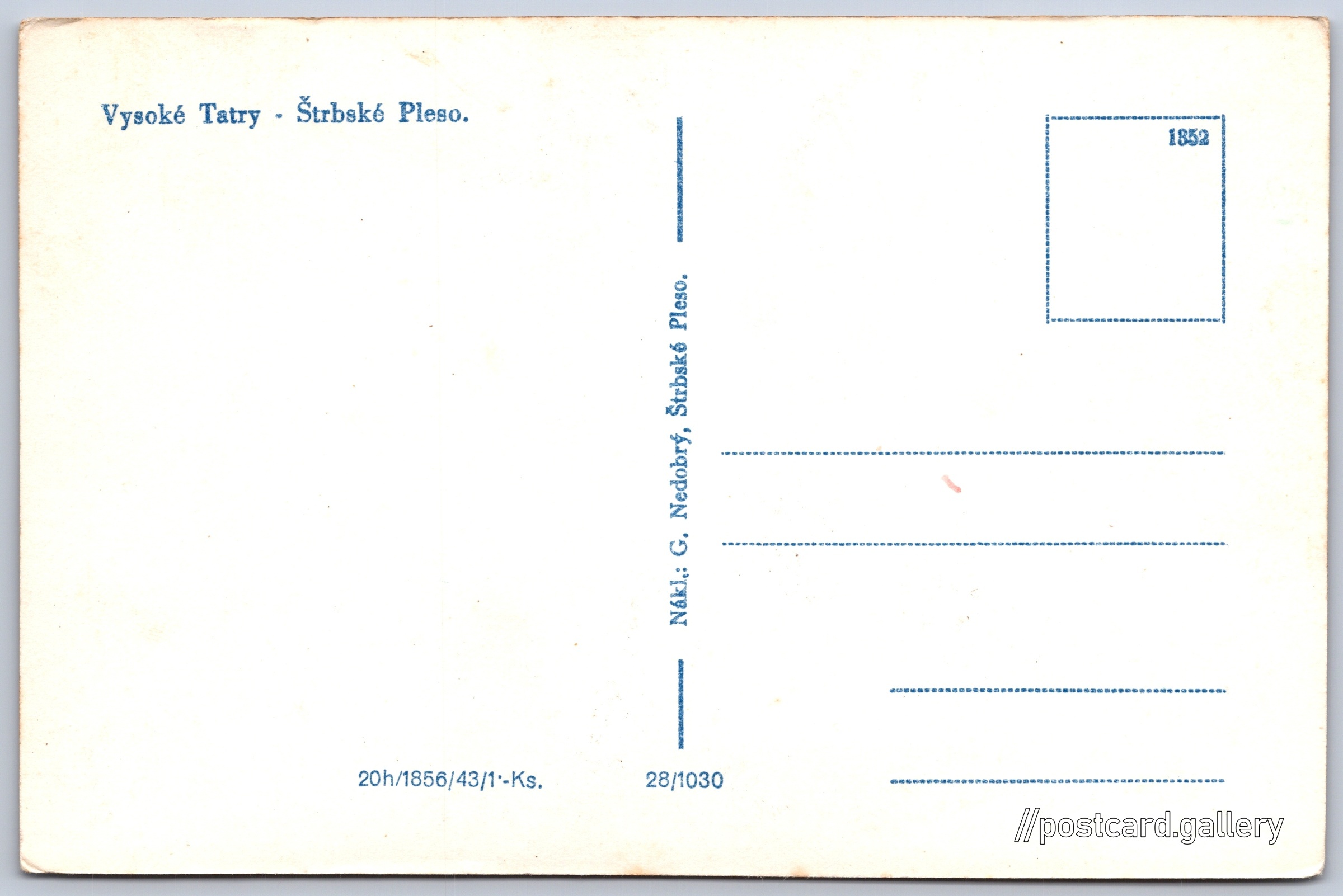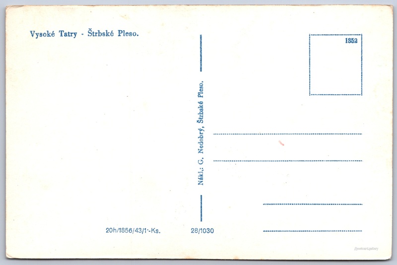Vysoké Tatry, Štrbské pleso, železnice Pokud chcete vidět pohlednice ve vyšším rozlišení nebo zobrazovat jejich zadní stranu, tak se prosím nejdříve přihlašte Přihlásit Zaregistrovat Vysoké Tatry - Štrbské Pleso. Jazyk tištěného textu na pohlednici: slovenština Štrba - Štrbské pleso ukázat na mapě V blízkém okolí místa zobrazeného na pohlednici lze najít 79 jiných pohlednic. Zobrazit blízké pohlednice Rok vydání pohlednice: 1943 Velikost (š x v) a tvar pohlednice: 139 x 92 mm (5.47" x 3.62"), obdélník Čistá pohlednice (neprošlá poštou) Ceny: Cena pohlednice: 1,00 Sk (SKK) (+0,20 Sk přípl. na tur. ruch) Kódy na pohlednici: 1856/43 28/1030 1352 DiskuseVložit příspěvek Přidat novou složku ... Spravovat složky ...
