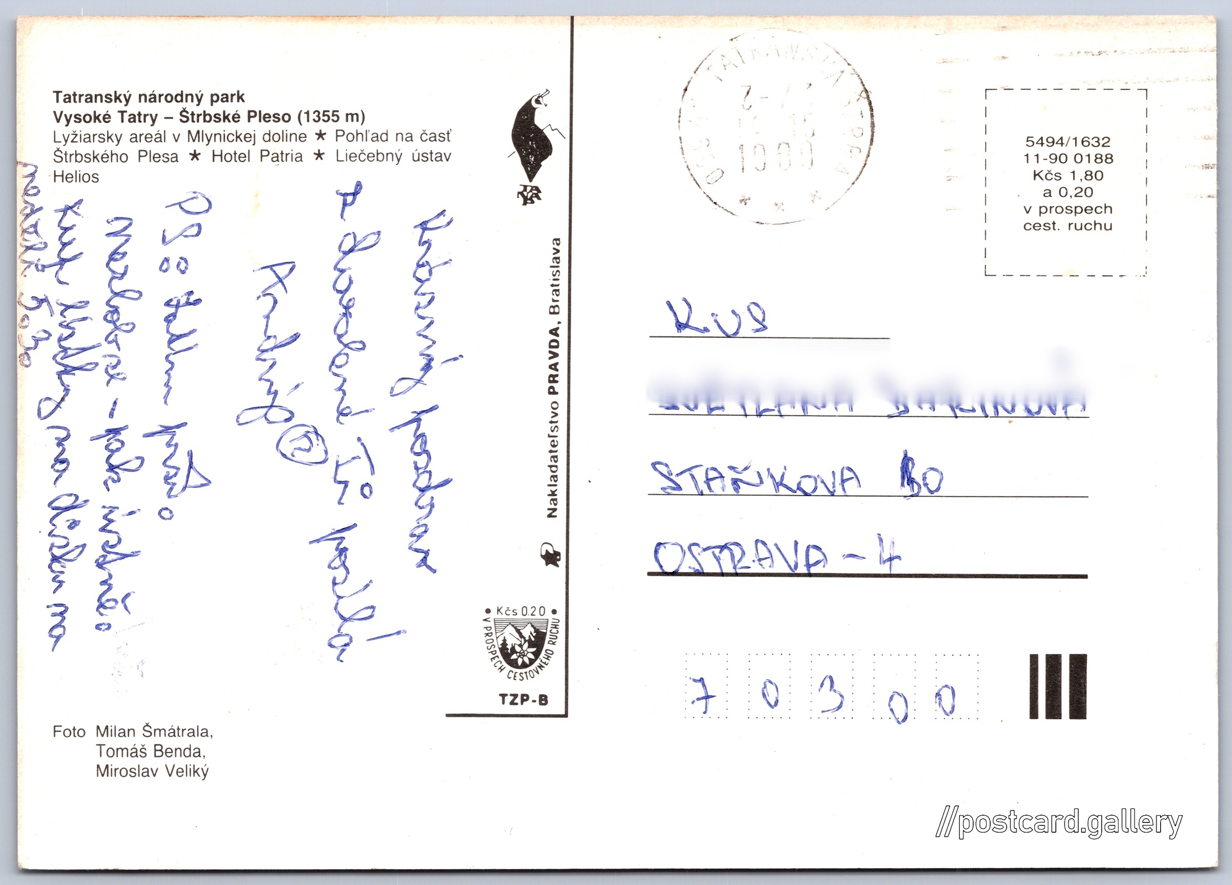 Vysoké Tatry, Štrbské pleso 2/8 Pokud chcete vidět pohlednice ve vyšším rozlišení nebo zobrazovat jejich zadní stranu, tak se prosím nejdříve přihlašte Přihlásit Zaregistrovat Štrbské pleso Tatranský národný parkVysoké Tatry - Štrbské Pleso (1355 m)- Lyžiarsky areál v Mlynickej doline- Pohľad na časť Štrbského Plesa- Hotel Patria- Liečebný ústav Helios Jazyk tištěného textu na pohlednici: slovenština Štrba - Štrbské pleso ukázat na mapě Vydavatel: Nakladateľstvo PRAVDA, Bratislava (Československo) Rok vydání pohlednice: leden, 1988 Velikost (š x v) a tvar pohlednice: 147 x 106 mm (5.79" x 4.17"), obdélník Osoby spjaté s touto pohlednicí: Milan Šmátrala(Autor fotografie) Miroslav Veliký(Autor fotografie) Tomáš Benda(Autor fotografie) Prošlá poštou Ceny: Cena pohlednice: 1,80 Kčs (CSK) (+0,20 Kčs přípl. na tur. ruch) Kódy na pohlednici: 5494/1632 11-90 0188 DiskuseVložit příspěvek Přidat novou složku ... Spravovat složky ...