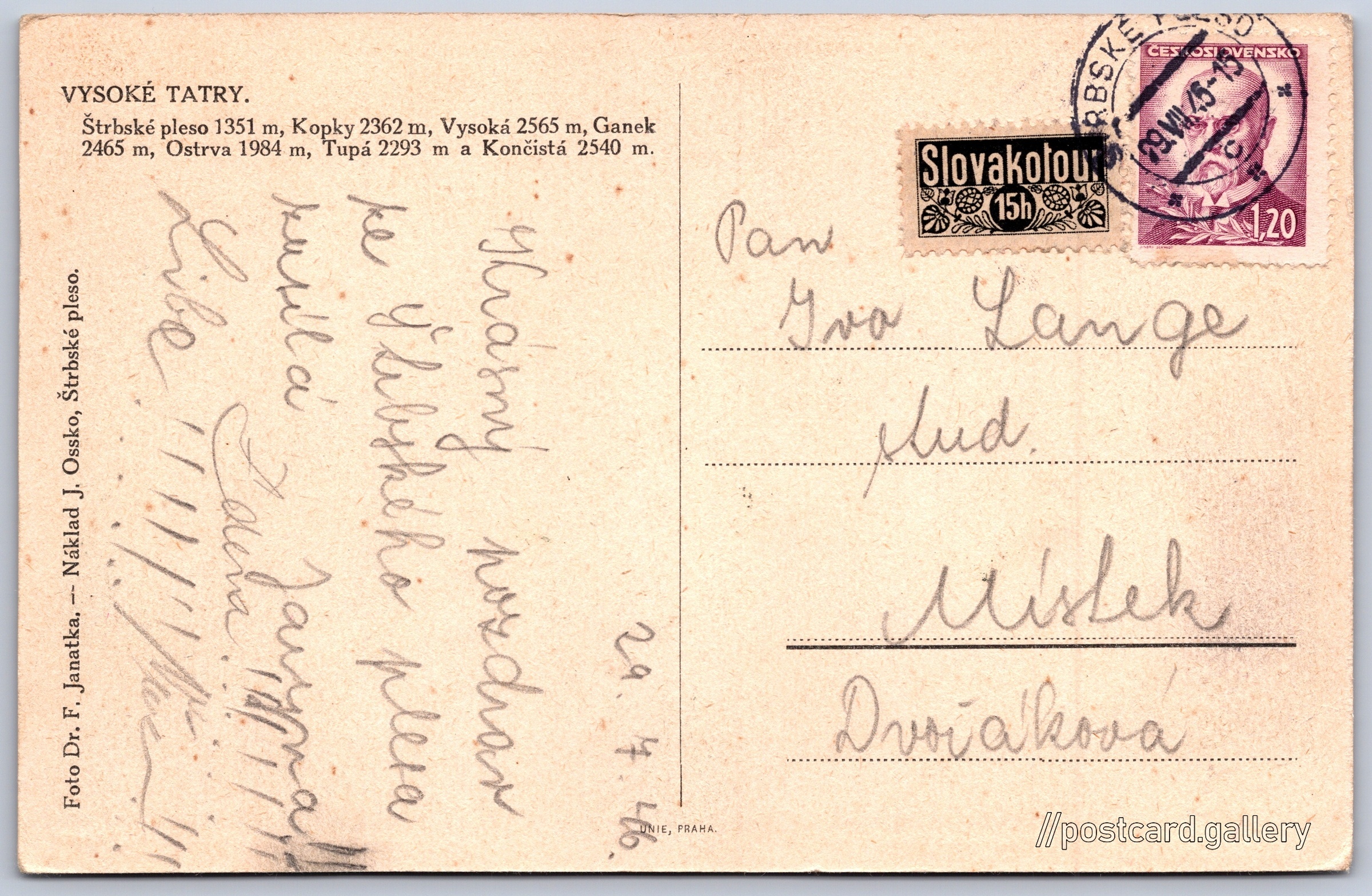 Vysoké Tatry, Štrbské pleso Pokud chcete vidět pohlednice ve vyšším rozlišení nebo zobrazovat jejich zadní stranu, tak se prosím nejdříve přihlašte Přihlásit Zaregistrovat VYSOKÉ TATRY.Štrbské pleso 1351 m, Kopky 2362 m, Vysoká 2565 m, Ganek 2465 m, Ostrva 1984 m, Tupá 2293 m a Končistá 2540 m. Jazyk tištěného textu na pohlednici: slovenština Štrbské pleso, Vodní plocha, Štrba, Slovensko ukázat na mapě Vydavatel: UNIE Praha (Československo)J. Ossko (Československo) Odhadované datum vydání pohlednice: 1943 - 1946 Pomozte nám zpřesnit rok vzniku pohlednice Velikost (š x v) a tvar pohlednice: 140 x 91 mm (5.51" x 3.58"), obdélník Osoby spjaté s touto pohlednicí: Dr. F. Janatka(Autor fotografie) Prošlá poštou:Datum na razítku: 29.7.1946Datum napsání pohledu: 29.7.1946 Ceny: Příplatek na tur. ruch: 0,15 Kčs (CSK))Vyplacené známky: 1,20 Kčs (CSK) DiskuseVložit příspěvek Přidat novou složku ... Spravovat složky ...