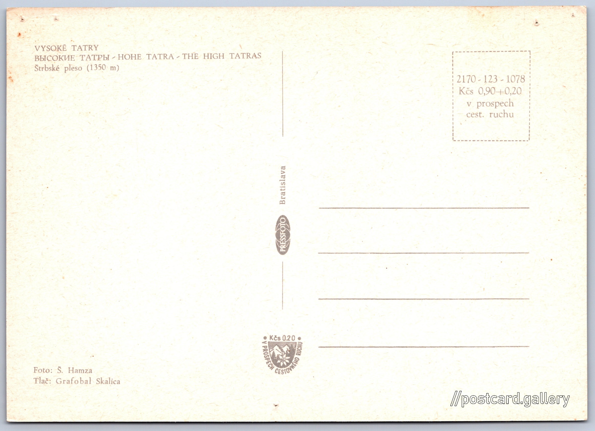 Vysoké Tatry, Štrbské pleso Pokud chcete vidět pohlednice ve vyšším rozlišení nebo zobrazovat jejich zadní stranu, tak se prosím nejdříve přihlašte Přihlásit Zaregistrovat VYSOKÉ TATRYВЫСОКИЕ ТАТРЫ - НOHE TATRA - THE HIGH TATRASŠtrbské pleso (1350 m) Jazyk tištěného textu na pohlednici: slovenština Štrba - Štrbské pleso ukázat na mapě V blízkém okolí místa zobrazeného na pohlednici lze najít 79 jiných pohlednic. Zobrazit blízké pohlednice Vydavatel: PressFoto Bratislava (Československo) Datum vydání není známo Pomozte nám odhadnout datum vzniku pohlednice Velikost (š x v) a tvar pohlednice: 149 x 106 mm (5.87" x 4.17"), obdélník Osoby spjaté s touto pohlednicí: Štefan Hamza(Autor fotografie) Čistá pohlednice (neprošlá poštou) Ceny: Cena pohlednice: 0,90 Kčs (CSK) (+0,20 Kčs přípl. na tur. ruch) Kódy na pohlednici: 2170-123-1078 DiskuseVložit příspěvek Přidat novou složku ... Spravovat složky ...