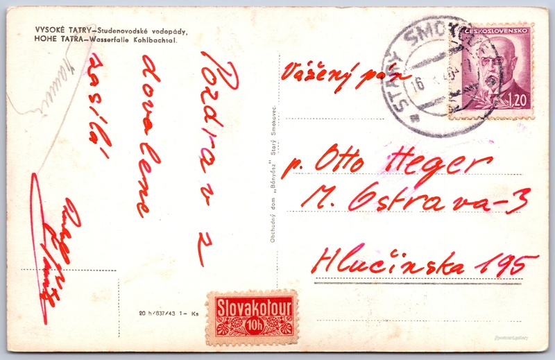Vysoké Tatry, Studenovodské vodopády 8/147 Pokud chcete vidět pohlednice ve vyšším rozlišení nebo zobrazovat jejich zadní stranu, tak se prosím nejdříve přihlašte Přihlásit Zaregistrovat VYSOKÉ TATRY - Studenovodské vodopády,HOHE TATRA - Wasserfalle Kohlbachtal. Jazyky tištěného textu na pohlednici: slovenština, němčina Tatranská Lomnica ukázat na mapě V blízkém okolí místa zobrazeného na pohlednici lze najít 155 jiných pohlednic. Zobrazit blízké pohlednice Vydavatel: Obchodný dom Bányász (Československo) Rok vydání pohlednice: 1943 Velikost (š x v) a tvar pohlednice: 139 x 89 mm (5.47" x 3.50"), obdélník Prošlá poštou Ceny: Cena pohlednice: 1,00 Sk (SKK) (+0,20 Sk přípl. na tur. ruch)Vyplacené známky: 1,20 Kčs (CSK) Kódy na pohlednici: 837/43 DiskuseVložit příspěvek Přidat novou složku ... Spravovat složky ...