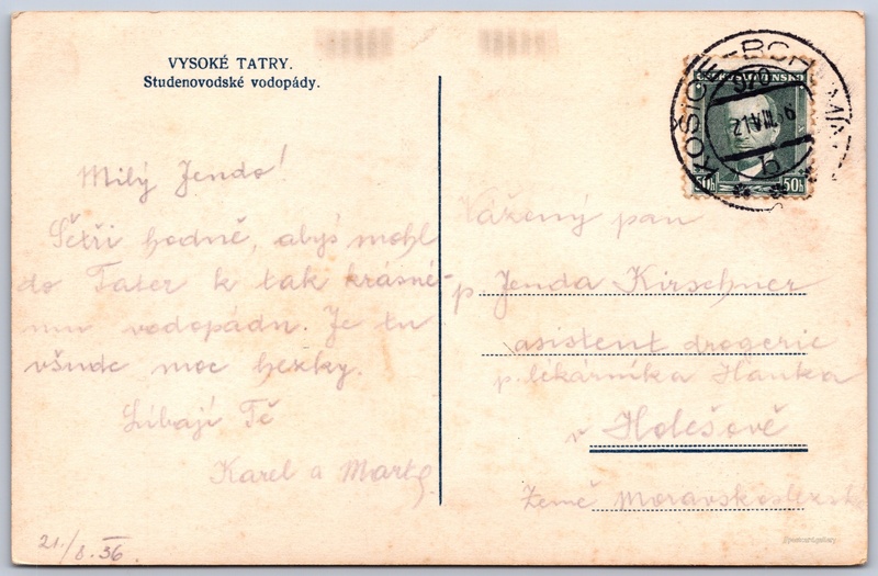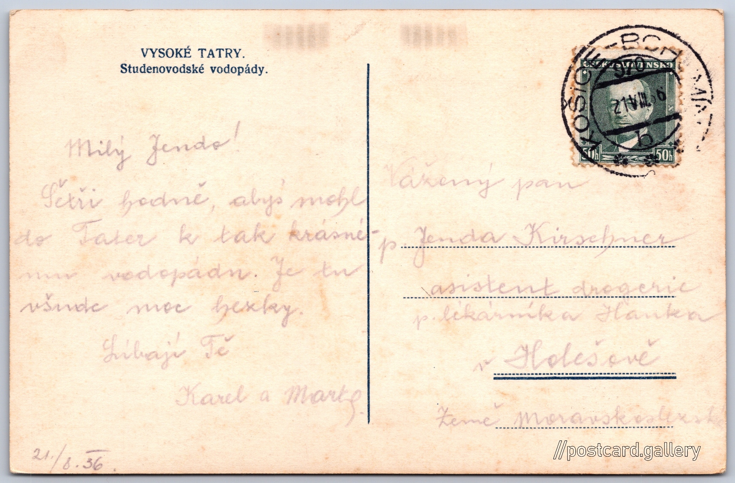 Vysoké Tatry, Studenovodské vodopády Pokud chcete vidět pohlednice ve vyšším rozlišení nebo zobrazovat jejich zadní stranu, tak se prosím nejdříve přihlašte Přihlásit Zaregistrovat VYSOKÉ TATRY.Studenovodské vodopády. Jazyk tištěného textu na pohlednici: slovenština Vodopády Studeného potoka, Vodopád, Vysoké Tatry - Tatranská Lomnica, Slovensko ukázat na mapě V blízkém okolí místa zobrazeného na pohlednici lze najít 159 jiných pohlednic. Zobrazit blízké pohlednice Odhadované datum vydání pohlednice: 1933 - 1936 Pomozte nám zpřesnit rok vzniku pohlednice Velikost (š x v) a tvar pohlednice: 140 x 92 mm (5.51" x 3.62"), obdélník Prošlá poštou:Datum na razítku: 21.8.1936Datum napsání pohledu: 21.8.1936 Ceny: Vyplacené známky: 0,50 Kčs (CSK) Kódy na pohlednici: 21112 DiskuseVložit příspěvek Přidat novou složku ... Spravovat složky ...