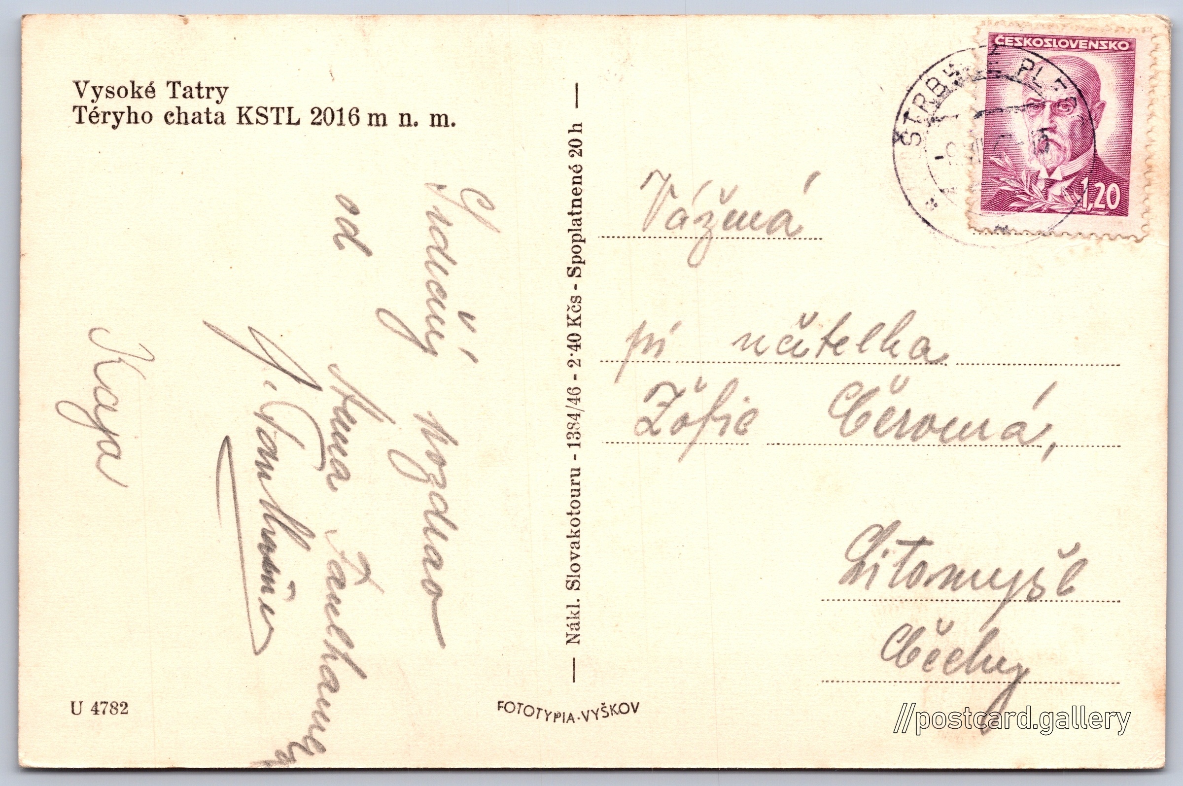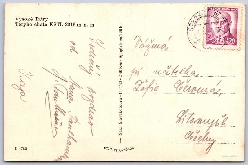 Vysoké Tatry, Téryho chata 7/140 Pokud chcete vidět pohlednice ve vyšším rozlišení nebo zobrazovat jejich zadní stranu, tak se prosím nejdříve přihlašte Přihlásit Zaregistrovat Vysoké TatryTéryho chata KSTL 2016 m n. m. Jazyk tištěného textu na pohlednici: slovenština Téryho chata, Chata, bouda, Na Pyšný štít 447, Vysoké Tatry - Tatranská Lomnica, Slovensko ukázat na mapě V blízkém okolí místa zobrazeného na pohlednici lze najít 140 jiných pohlednic. Zobrazit blízké pohlednice Vydavatel: Fototypia - Vyškov (Československo)Slovakotour (Československo) Odhadované datum vydání pohlednice: 1946 - 1947 Pomozte nám zpřesnit rok vzniku pohlednice Velikost (š x v) a tvar pohlednice: 137 x 91 mm (5.39" x 3.58"), obdélník Prošlá poštou:Datum na razítku: 9.7.1947 Ceny: Cena pohlednice: 2,40 Kčs (CSK) (+0,20 Kčs přípl. na tur. ruch)Vyplacené známky: 1,20 Kčs (CSK) Kódy na pohlednici: 1384/46 U 4782 DiskuseVložit příspěvek Přidat novou složku ... Spravovat složky ...