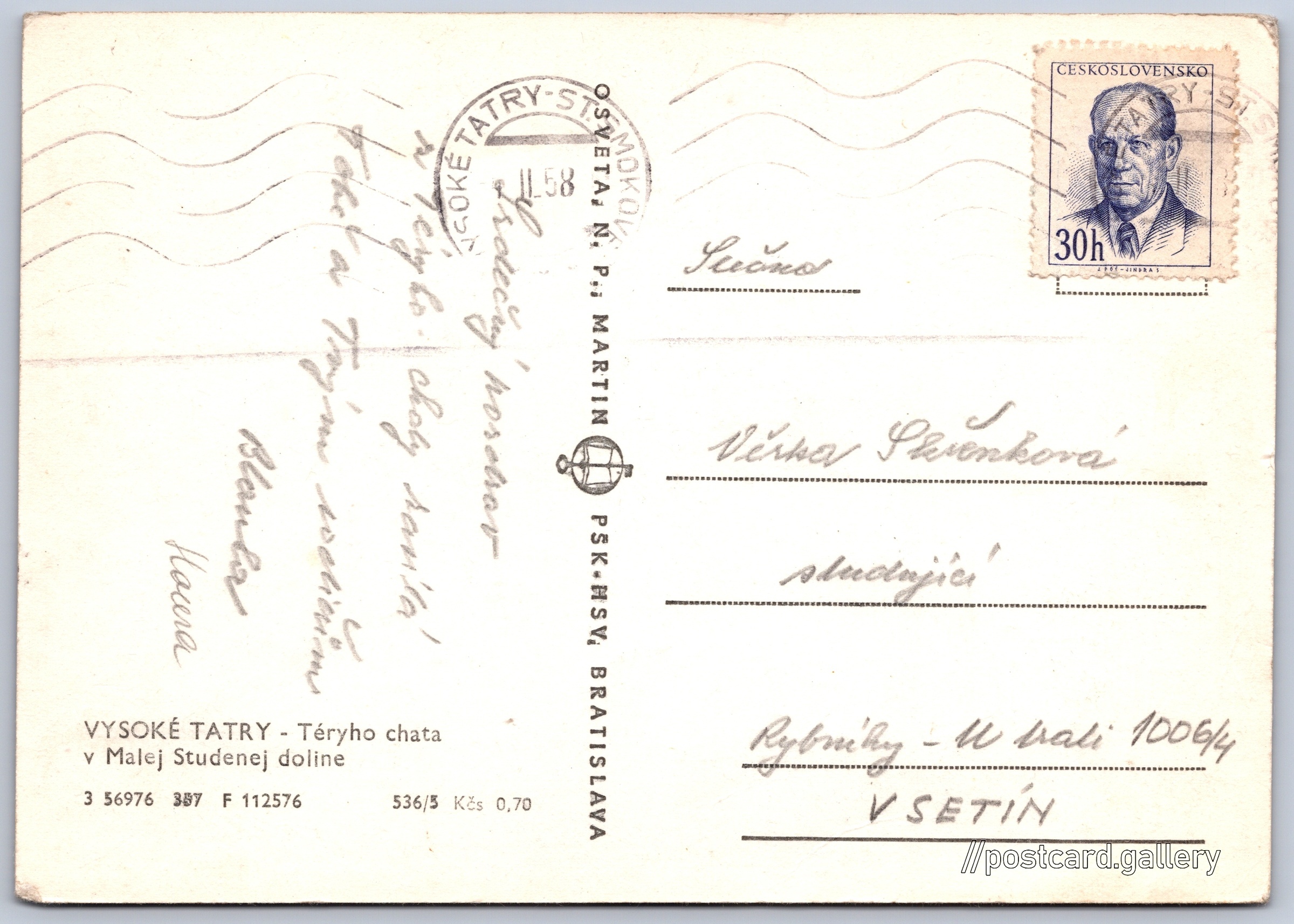 Vysoké Tatry, Téryho chata Pokud chcete vidět pohlednice ve vyšším rozlišení nebo zobrazovat jejich zadní stranu, tak se prosím nejdříve přihlašte Přihlásit Zaregistrovat VYSOKÉ TATRY - Téryho chata v Malej Studenej doline Jazyk tištěného textu na pohlednici: slovenština Téryho chata, Chata, bouda, Na Pyšný štít 447, Vysoké Tatry - Tatranská Lomnica, Slovensko ukázat na mapě V blízkém okolí místa zobrazeného na pohlednici lze najít 140 jiných pohlednic. Zobrazit blízké pohlednice Vydavatel: Osveta, n. p., Martin PŠK - Bratislava (Československo) Rok vydání pohlednice: březen, 1957 Velikost (š x v) a tvar pohlednice: 146 x 103 mm (5.75" x 4.06"), obdélník Prošlá poštou Ceny: Cena pohlednice: 0,70 Kčs (CSK)Vyplacené známky: 0,30 Kčs (CSK) Kódy na pohlednici: 3 56976 357 F 112576 536/5 DiskuseVložit příspěvek Přidat novou složku ... Spravovat složky ...