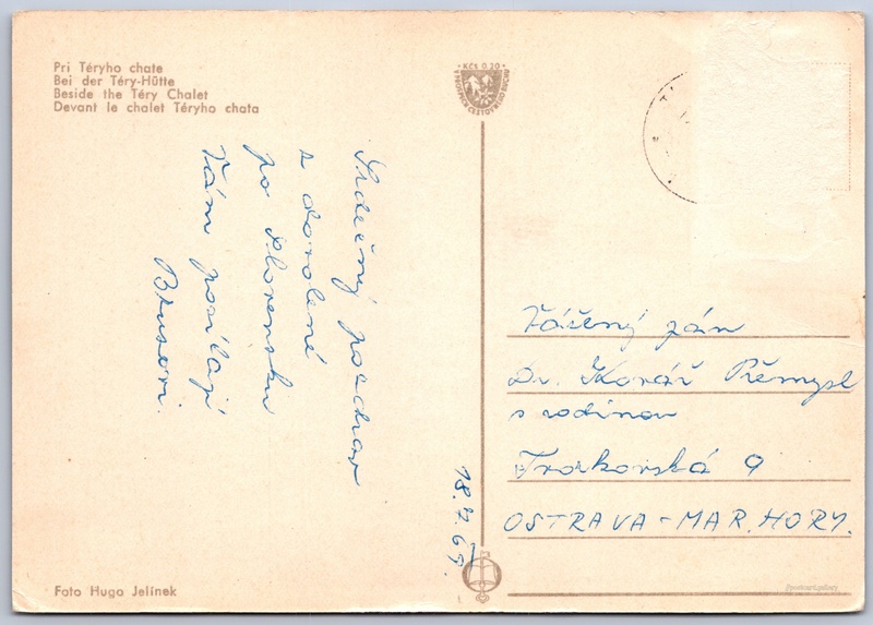 Vysoké Tatry, u Téryho chaty Pokud chcete vidět pohlednice ve vyšším rozlišení nebo zobrazovat jejich zadní stranu, tak se prosím nejdříve přihlašte Přihlásit Zaregistrovat Pri Téryho chateBei der Téry-HütteBeside the Téry ChaletDevant le chalet Téryho chata Jazyk tištěného textu na pohlednici: čeština Tatranská Lomnica ukázat na mapě V blízkém okolí místa zobrazeného na pohlednici lze najít 139 jiných pohlednic. Zobrazit blízké pohlednice Vydavatel: Nakladatelství Orbis (Československo) Odhadované datum vydání pohlednice: 1966 - 1969 Pomozte nám zpřesnit rok vzniku pohlednice Velikost (š x v) a tvar pohlednice: 147 x 104 mm (5.79" x 4.09"), obdélník Osoby spjaté s touto pohlednicí: Hugo Jelínek(Autor fotografie) Prošlá poštou:Datum na razítku: 18.7.1969Datum napsání pohledu: 18.7.1969 Ceny: Příplatek na tur. ruch: 0,20 Kčs (CSK)) DiskuseVložit příspěvek Přidat novou složku ... Spravovat složky ...