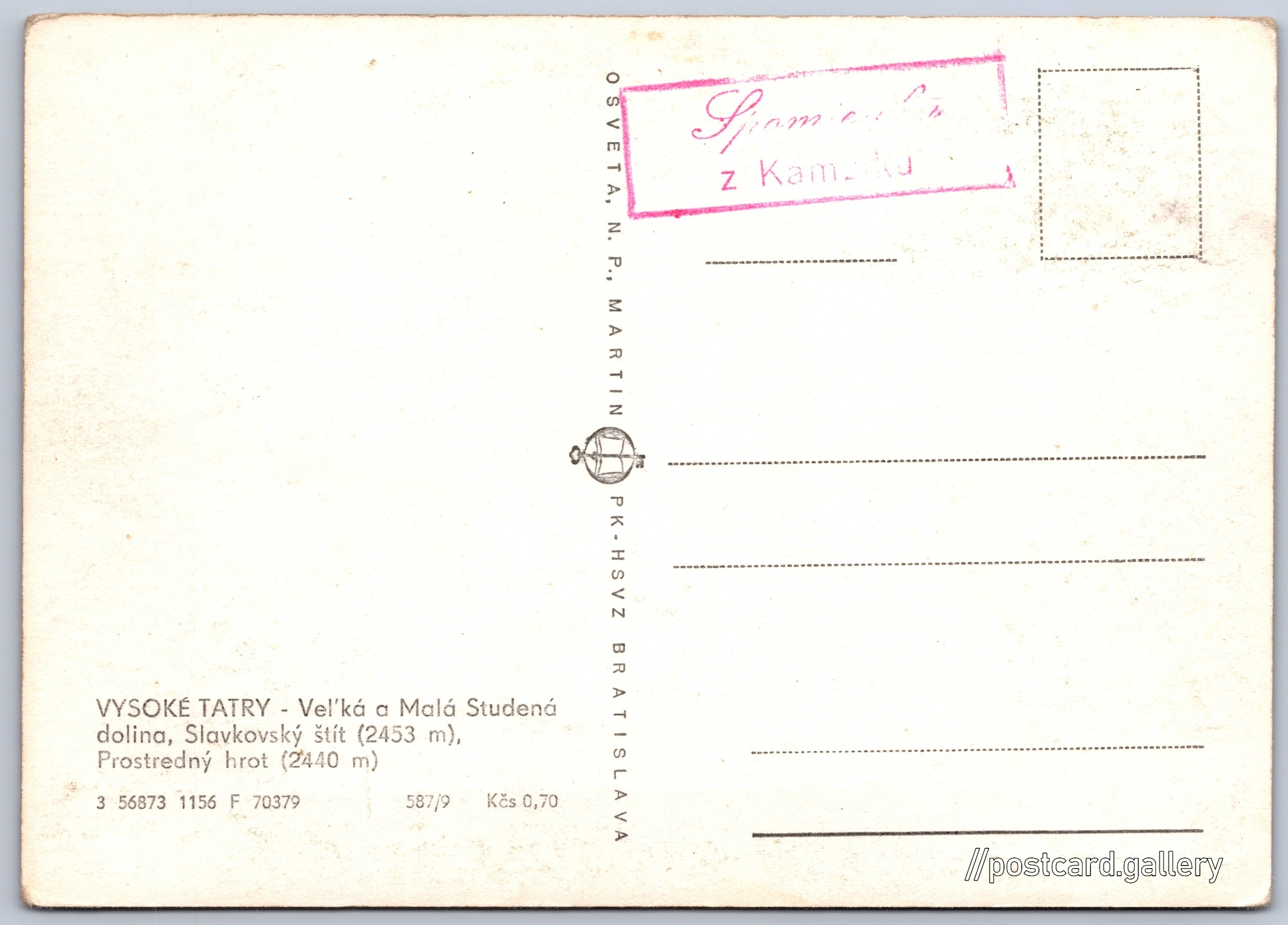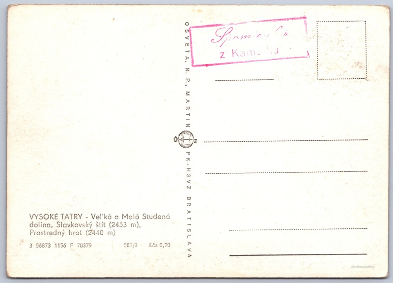 Vysoké Tatry, Velká a malá studená dolina Pokud chcete vidět pohlednice ve vyšším rozlišení nebo zobrazovat jejich zadní stranu, tak se prosím nejdříve přihlašte Přihlásit Zaregistrovat VYSOKÉ TATRY - Vel'ká a Malá Studená dolina, Slavkovský štít (2453 m), Prostredný hrot (2440 m) Jazyk tištěného textu na pohlednici: slovenština Velká Studená dolina, Kaňon, rokle, soutěska, údolí, Vysoké Tatry - Tatranská Lomnica, Slovensko ukázat na mapě V blízkém okolí místa zobrazeného na pohlednici lze najít 166 jiných pohlednic. Zobrazit blízké pohlednice Vydavatel: Osveta, n. p., Martin PŠK - Bratislava (Československo) Rok vydání pohlednice: listopad, 1956 Velikost (š x v) a tvar pohlednice: 148 x 105 mm (5.83" x 4.13"), obdélník Čistá pohlednice (neprošlá poštou) Ceny: Cena pohlednice: 0,70 Kčs (CSK) Kódy na pohlednici: 3 56873 1156 F 70379 587/9 DiskuseVložit příspěvek Přidat novou složku ... Spravovat složky ...