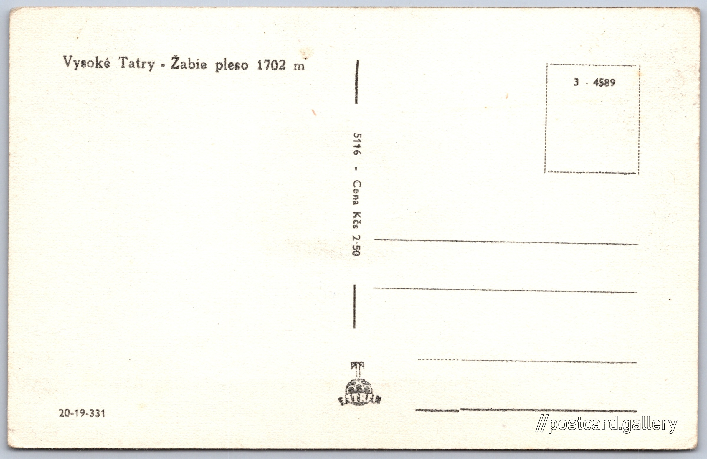 Vysoké Tatry, Žabí pleso Pokud chcete vidět pohlednice ve vyšším rozlišení nebo zobrazovat jejich zadní stranu, tak se prosím nejdříve přihlašte Přihlásit Zaregistrovat Vysoké Tatry - Žabie pleso 1702 m Jazyk tištěného textu na pohlednici: slovenština Žabie Javorové pleso, Vodní plocha, Tatranská Javorina, Slovensko ukázat na mapě V blízkém okolí místa zobrazeného na pohlednici lze najít 134 jiných pohlednic. Zobrazit blízké pohlednice Vydavatel: Tatran (Československo) Datum vydání není známo Pomozte nám odhadnout datum vzniku pohlednice Velikost (š x v) a tvar pohlednice: 140 x 89 mm (5.51" x 3.50"), obdélník Čistá pohlednice (neprošlá poštou) Ceny: Cena pohlednice: 2,50 Kčs (CSK) Kódy na pohlednici: 3 4589 5116 20-19-331 DiskuseVložit příspěvek Přidat novou složku ... Spravovat složky ...