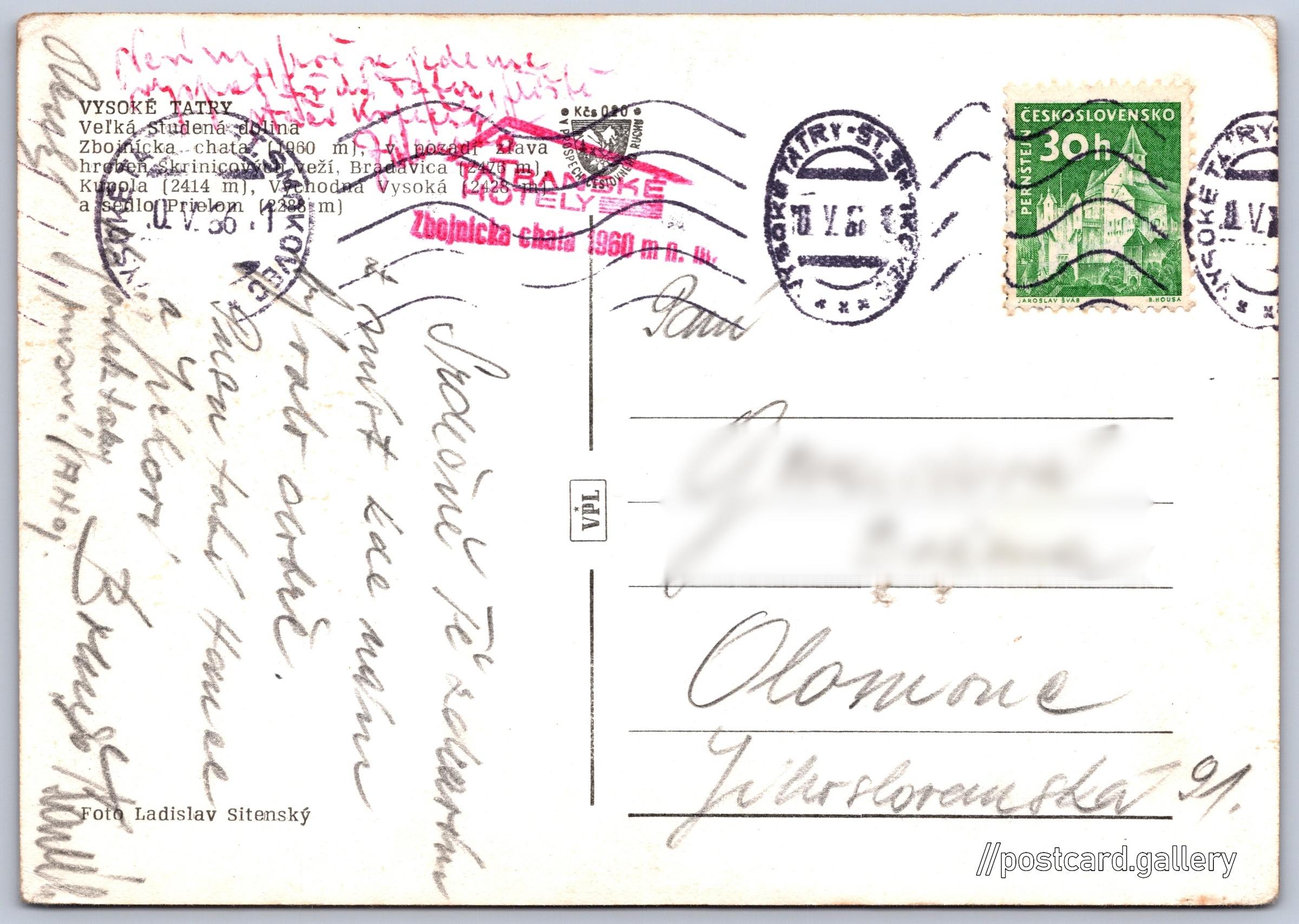 Vysoké Tatry, Zbojnická chata Pokud chcete vidět pohlednice ve vyšším rozlišení nebo zobrazovat jejich zadní stranu, tak se prosím nejdříve přihlašte Přihlásit Zaregistrovat VYSOKÉ TATRYVeľká studená dolinaZbojnícka chata (1960 m), vpozadi zľava hrebeň Skrinicových veží, Bradavica (2476 m), Kupola (2414 m), Východná Vysoká (2428 m) a sedlo Prielom (2288 m) Jazyk tištěného textu na pohlednici: slovenština Zbojnická chata, Chata, bouda, Tatranská Lomnica 446, Vysoké Tatry - Tatranská Lomnica, Slovensko ukázat na mapě V blízkém okolí místa zobrazeného na pohlednici lze najít 148 jiných pohlednic. Zobrazit blízké pohlednice Vydavatel: VPL (Československo) Odhadované datum vydání pohlednice: 1963 - 1966 Pomozte nám zpřesnit rok vzniku pohlednice Velikost (š x v) a tvar pohlednice: 146 x 103 mm (5.75" x 4.06"), obdélník Osoby spjaté s touto pohlednicí: Ladislav Sitenský(Autor fotografie) Prošlá poštou:Datum na razítku: 10.5.1966 Ceny: Příplatek na tur. ruch: 0,20 Kčs (CSK))Vyplacené známky: 0,30 Kčs (CSK) DiskuseVložit příspěvek Přidat novou složku ... Spravovat složky ...