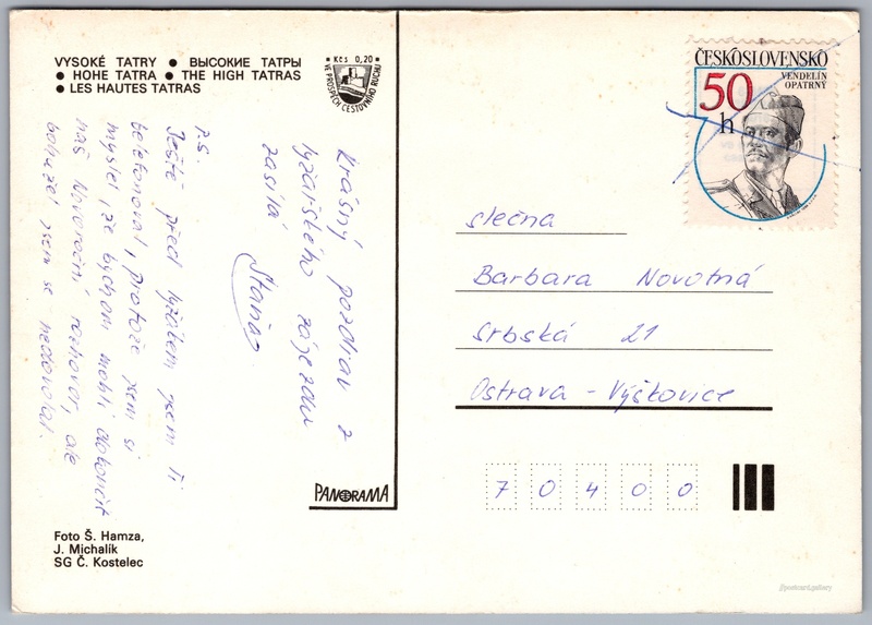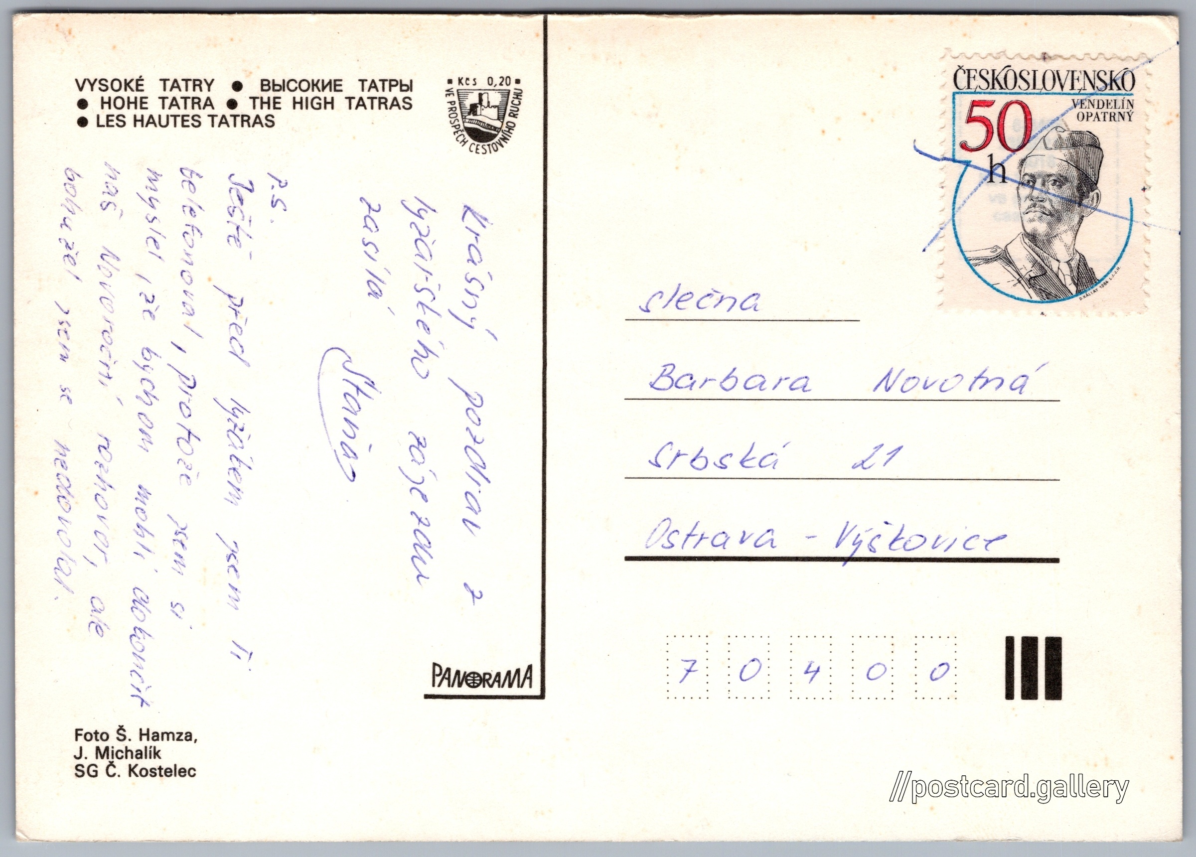 Vysoké Tatry, zima Pokud chcete vidět pohlednice ve vyšším rozlišení nebo zobrazovat jejich zadní stranu, tak se prosím nejdříve přihlašte Přihlásit Zaregistrovat Vysoké Tatry VYSOKÉ TATRY - HOHE TATRA - ВЫСОКИЕ ТАТРЫ - THE HIGH TATRAS - LES HAUTES TATRAS Jazyk tištěného textu na pohlednici: čeština Štrba 4023 ukázat na mapě V blízkém okolí místa zobrazeného na pohlednici lze najít 79 jiných pohlednic. Zobrazit blízké pohlednice Vydavatel: Panorama (Československo) Odhadované datum vydání pohlednice: 1980 - 1984 Pomozte nám zpřesnit rok vzniku pohlednice Velikost (š x v) a tvar pohlednice: 148 x 106 mm (5.83" x 4.17"), obdélník Osoby spjaté s touto pohlednicí: Ján Michalík(Autor fotografie) Štefan Hamza(Autor fotografie) Prošlá poštou Ceny: Příplatek na tur. ruch: 0,20 Kčs (CSK))Vyplacené známky: 0,50 Kčs (CSK) DiskuseVložit příspěvek Přidat novou složku ... Spravovat složky ...