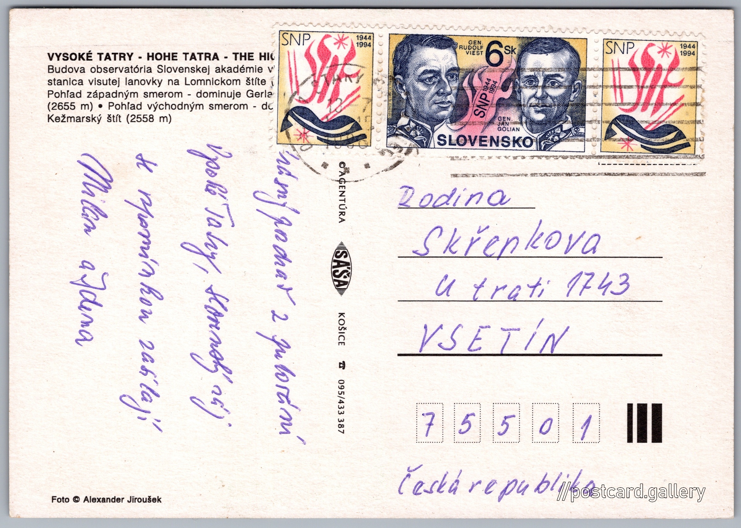 Vysoké Tatry, zima 3/163 Pokud chcete vidět pohlednice ve vyšším rozlišení nebo zobrazovat jejich zadní stranu, tak se prosím nejdříve přihlašte Přihlásit Zaregistrovat Vysoké Tatry Text je vynechán, protože není celý kompletně čitelný Jazyk tištěného textu na pohlednici: slovenština Lomnický štít (2634 m), Hora, výškový bod, Vysoké Tatry - Tatranská Lomnica, Slovensko ukázat na mapě V blízkém okolí místa zobrazeného na pohlednici lze najít 135 jiných pohlednic. Zobrazit blízké pohlednice Vydavatel: Agentúra Sáša Košice (Slovensko) Datum vydání není známo Pomozte nám odhadnout datum vzniku pohlednice Velikost (š x v) a tvar pohlednice: 148 x 104 mm (5.83" x 4.09"), obdélník Osoby spjaté s touto pohlednicí: Alexander Jiroušek(Autor fotografie) Prošlá poštou Ceny: Vyplacené známky: 6,00 Sk (SKK) DiskuseVložit příspěvek Přidat novou složku ... Spravovat složky ...