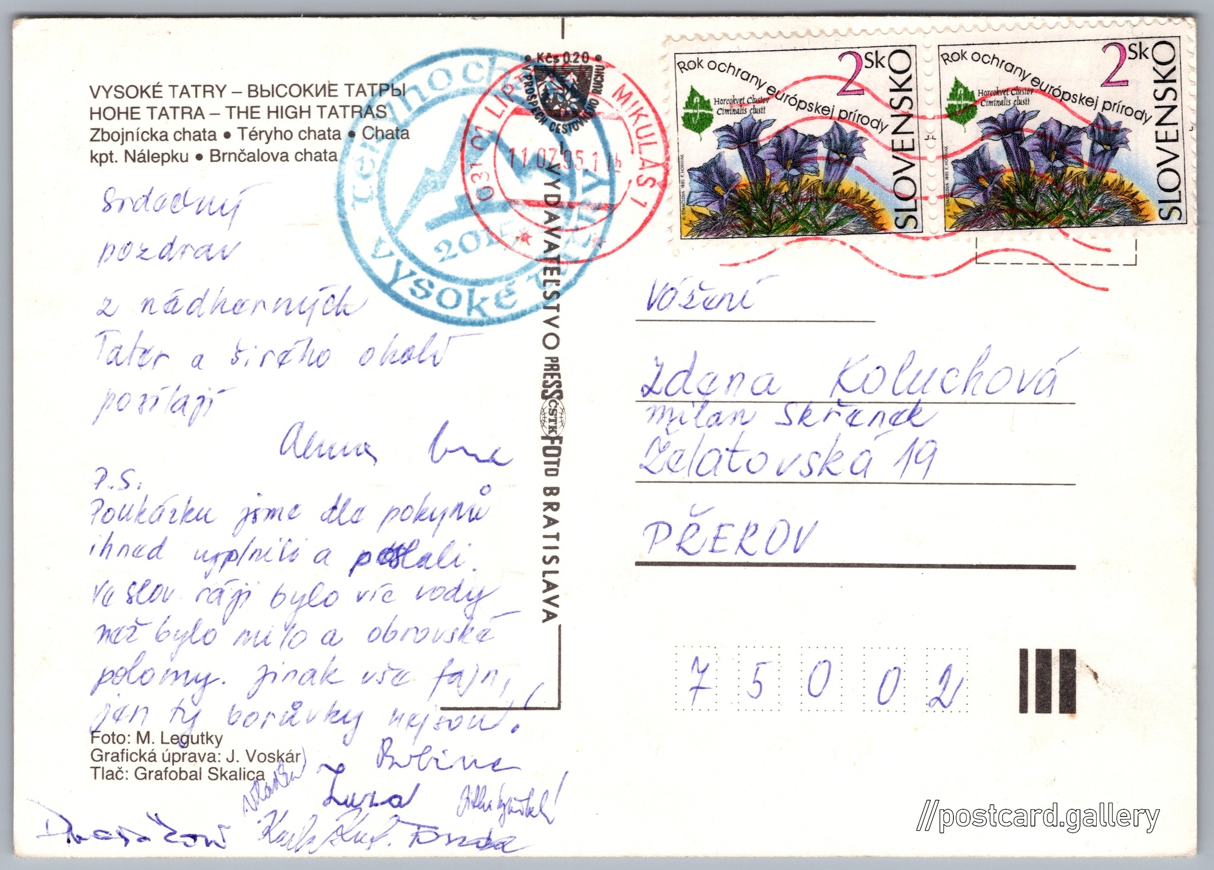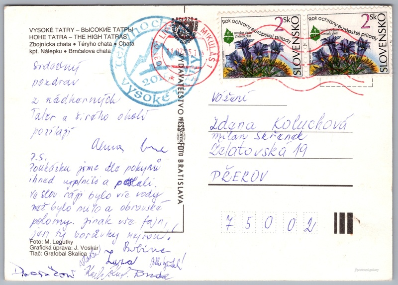Vysoké Tatry Pokud chcete vidět pohlednice ve vyšším rozlišení nebo zobrazovat jejich zadní stranu, tak se prosím nejdříve přihlašte Přihlásit Zaregistrovat Vysoké Tatry VYSOKÉ TATRY – ВЫСОКИЕ ТАТРЫHOHE TATRA - THE HIGH TATRAS- Zbojnícka chata- Téryho chata- Chata kpt. Nálepku- Brnčalova chata Jazyk tištěného textu na pohlednici: slovenština Zbojnická chata, Chata, bouda, Tatranská Lomnica 446, Vysoké Tatry - Tatranská Lomnica, Slovensko ukázat na mapě V blízkém okolí místa zobrazeného na pohlednici lze najít 179 jiných pohlednic. Zobrazit blízké pohlednice Vydavatel: PressFoto Bratislava (Československo) Odhadované datum vydání pohlednice: 1989 - 1995 Pomozte nám zpřesnit rok vzniku pohlednice Velikost (š x v) a tvar pohlednice: 148 x 106 mm (5.83" x 4.17"), obdélník Osoby spjaté s touto pohlednicí: J. Voskár(Design pohlednice) Prošlá poštou:Datum na razítku: 11.7.1995 Ceny: Příplatek na tur. ruch: 0,20 Kčs (CSK))Vyplacené známky: 4,00 Sk (SKK) DiskuseVložit příspěvek Přidat novou složku ... Spravovat složky ...