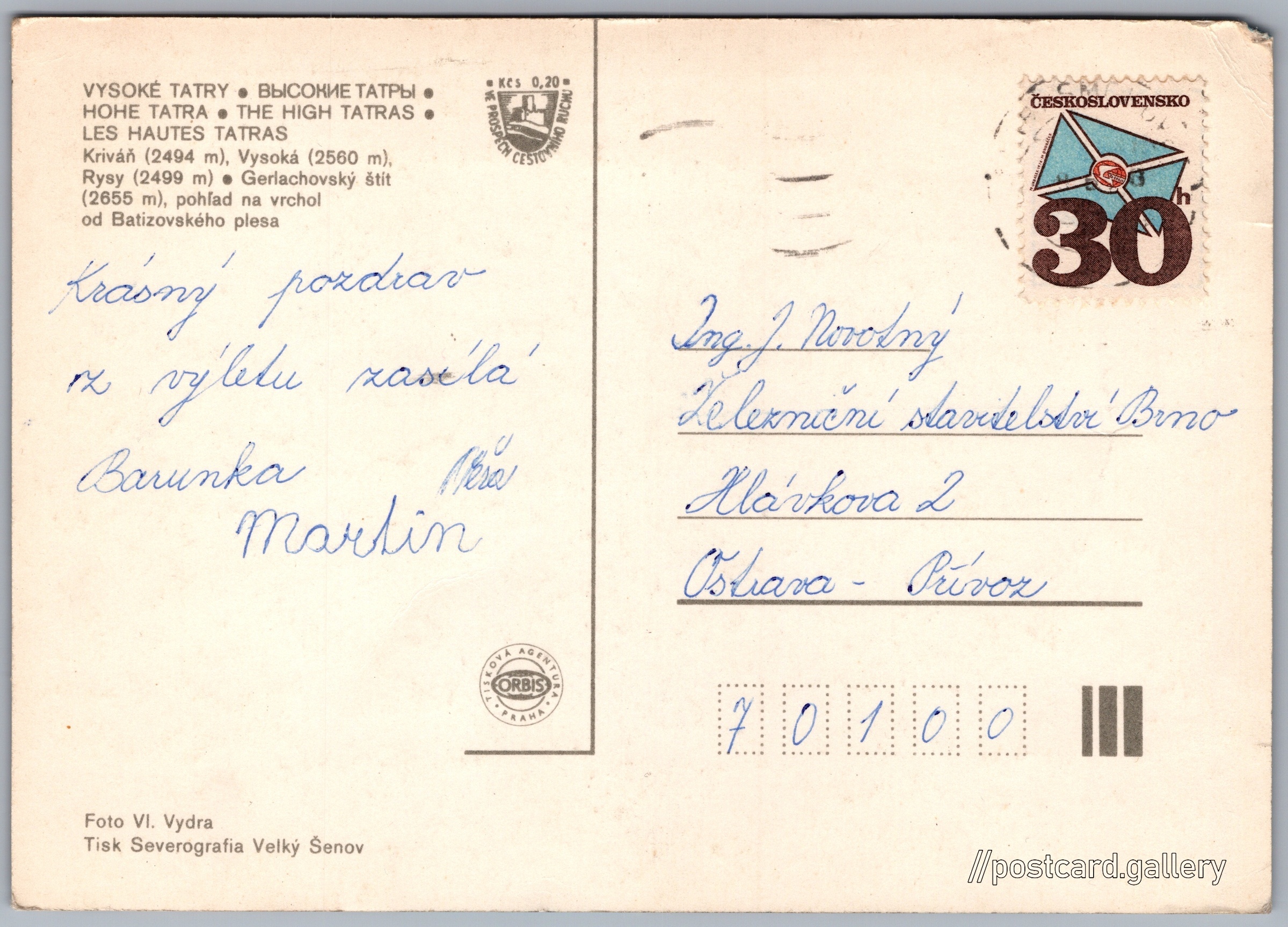 Vysoké Tatry Pokud chcete vidět pohlednice ve vyšším rozlišení nebo zobrazovat jejich zadní stranu, tak se prosím nejdříve přihlašte Přihlásit Zaregistrovat Vysoké Tatry VYSOKE TATRY - ВЫСОКИЕ ТАТЫ - HOHE TATRA - THE HIGH TATRAS - LES HAUTES TATRAS- Kriváň (2494 m), Vysoká (2560 m), Rysy (2499 m) Gerlachovský štít(2655 m)- pohľad na vrchol od Batizovského plesa Jazyk tištěného textu na pohlednici: čeština Kriváň (2494 m), Hora, výškový bod, Vysoké Tatry - Štrbské Pleso, Slovensko ukázat na mapě V blízkém okolí místa zobrazeného na pohlednici lze najít 115 jiných pohlednic. Zobrazit blízké pohlednice Vydavatel: Nakladatelství Orbis (Československo) Datum vydání není známo Pomozte nám odhadnout datum vzniku pohlednice Velikost (š x v) a tvar pohlednice: 148 x 105 mm (5.83" x 4.13"), obdélník Osoby spjaté s touto pohlednicí: Vl. Vydra(Autor fotografie) Prošlá poštou Ceny: Vyplacené známky: 0,30 Kčs (CSK) DiskuseVložit příspěvek Přidat novou složku ... Spravovat složky ...