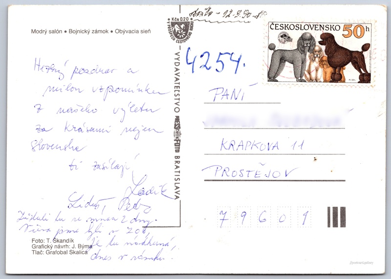 Zámek Bojnice Pokud chcete vidět pohlednice ve vyšším rozlišení nebo zobrazovat jejich zadní stranu, tak se prosím nejdříve přihlašte Přihlásit Zaregistrovat Bojnice - Modrý salón- Bojnický zámok- Obývacia sieň Jazyk tištěného textu na pohlednici: slovenština Bojnický zámek, Zámek, Zámok a okolie 1/1, Bojnice, Slovensko ukázat na mapě Vydavatel: PressFoto Bratislava (Československo) Odhadované datum vydání pohlednice: 1987 - 1990 Pomozte nám zpřesnit rok vzniku pohlednice Velikost (š x v) a tvar pohlednice: 148 x 105 mm (5.83" x 4.13"), obdélník Osoby spjaté s touto pohlednicí: J. Býma(Design pohlednice) T. Škandík(Autor fotografie) Prošlá poštou:Datum na razítku: 11.9.1990 Ceny: Příplatek na tur. ruch: 0,20 Kčs (CSK))Vyplacené známky: 0,50 Kčs (CSK) DiskuseVložit příspěvek Přidat novou složku ... Spravovat složky ...