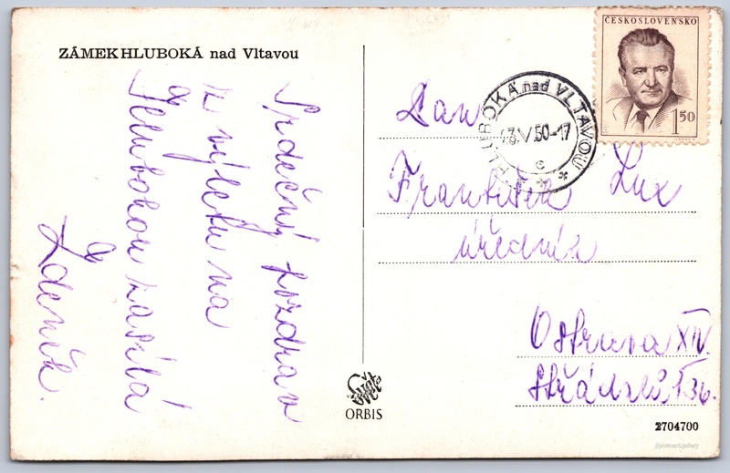Zámek Hluboká nad Vltavou 6/12 Pokud chcete vidět pohlednice ve vyšším rozlišení nebo zobrazovat jejich zadní stranu, tak se prosím nejdříve přihlašte Přihlásit Zaregistrovat ZÁMEK HLUBOKÁ nad Vltavou Jazyk tištěného textu na pohlednici: čeština Hluboká nad Vltavou, České Budějovice ukázat na mapě V blízkém okolí místa zobrazeného na pohlednici lze najít 12 jiných pohlednic. Zobrazit blízké pohlednice Vydavatel: Nakladatelství Orbis (Československo) Odhadované datum vydání pohlednice: 1948 - 1950 Pomozte nám zpřesnit rok vzniku pohlednice Velikost (š x v) a tvar pohlednice: 140 x 90 mm (5.51" x 3.54"), obdélník Prošlá poštou:Datum na razítku: 23.5.1950 Ceny: Vyplacené známky: 1,50 Kčs (CSK) Kódy na pohlednici: 2704700 DiskuseVložit příspěvek Přidat novou složku ... Spravovat složky ...