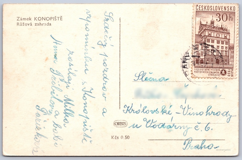 Zámek Konopiště, Růžová zahrada 6/7 Pokud chcete vidět pohlednice ve vyšším rozlišení nebo zobrazovat jejich zadní stranu, tak se prosím nejdříve přihlašte Přihlásit Zaregistrovat Zámek KONOPIŠTĚRůžová zahrada Jazyk tištěného textu na pohlednici: čeština Růžová zahrada Konopiště, Zahrada, park, Benešov - Konopiště, Středočeský kraj, Česko ukázat na mapě V blízkém okolí místa zobrazeného na pohlednici lze najít 7 jiných pohlednic. Zobrazit blízké pohlednice Vydavatel: Nakladatelství Orbis (Československo) Odhadované datum vydání pohlednice: 1953 - 1957 Pomozte nám zpřesnit rok vzniku pohlednice Velikost (š x v) a tvar pohlednice: 137 x 89 mm (5.39" x 3.50"), obdélník Prošlá poštou Ceny: Cena pohlednice: 0,50 Kčs (CSK)Vyplacené známky: 0,30 Kčs (CSK) DiskuseVložit příspěvek Přidat novou složku ... Spravovat složky ...