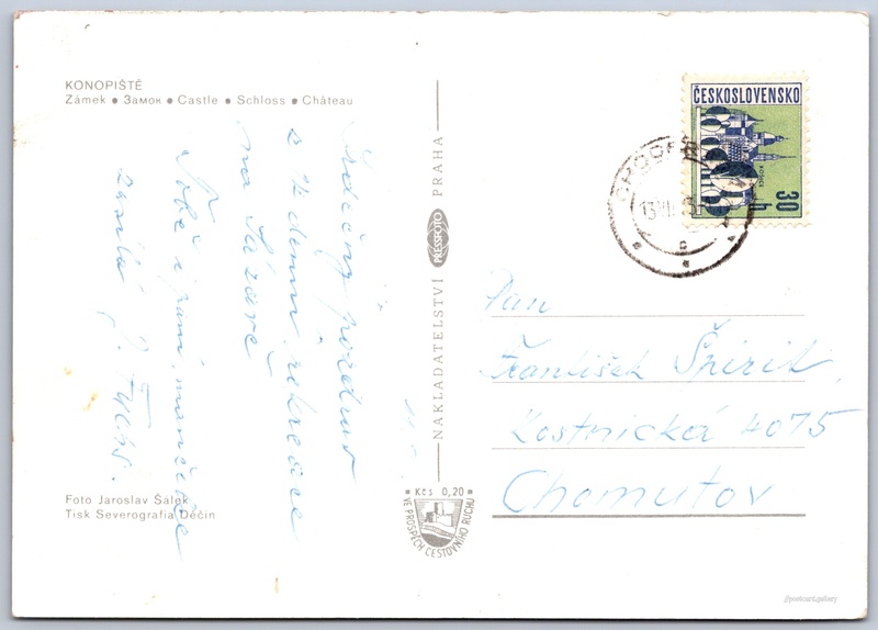 Zámek Konopiště Pokud chcete vidět pohlednice ve vyšším rozlišení nebo zobrazovat jejich zadní stranu, tak se prosím nejdříve přihlašte Přihlásit Zaregistrovat KONOPIŠTĚ- Zámek- Замок- Castle- Schloss- Chateau Jazyky tištěného textu na pohlednici: čeština, ruština, angličtina, němčina, francouzština, francouzština Zámek Konopiště, Zámek, Konopiště 1, Benešov - Konopiště, Středočeský kraj, Česko ukázat na mapě V blízkém okolí místa zobrazeného na pohlednici lze najít 7 jiných pohlednic. Zobrazit blízké pohlednice Vydavatel: PressFoto Praha (Československo) Odhadované datum vydání pohlednice: 1960 - 1963 Pomozte nám zpřesnit rok vzniku pohlednice Velikost (š x v) a tvar pohlednice: 148 x 105 mm (5.83" x 4.13"), obdélník Osoby spjaté s touto pohlednicí: Jaroslav Šálek(Autor fotografie) Prošlá poštou:Datum na razítku: 13.7.1963 Ceny: Příplatek na tur. ruch: 0,20 Kčs (CSK))Vyplacené známky: 0,30 Kčs (CSK) DiskuseVložit příspěvek Přidat novou složku ... Spravovat složky ...