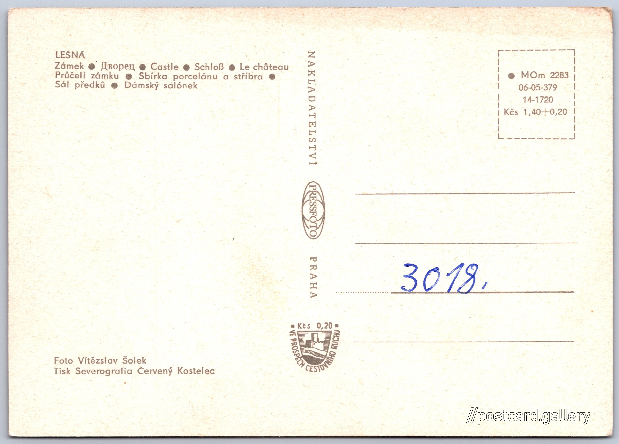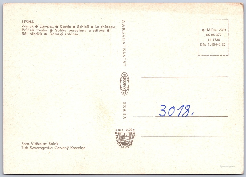 Zámek Lešná Pokud chcete vidět pohlednice ve vyšším rozlišení nebo zobrazovat jejich zadní stranu, tak se prosím nejdříve přihlašte Přihlásit Zaregistrovat Zámek Lešná LEŠNÁZámek - Дворец - Castle - Schloß - Le château- Průčelí zámku- Sbírka porcelánu a stříbra- Sál předků- Dámský salónek Jazyk tištěného textu na pohlednici: čeština Zámek Lešná, Zámek, Lukovská 112, Zlín - Štípa, Česko ukázat na mapě V blízkém okolí místa zobrazeného na pohlednici lze najít 5 jiných pohlednic. Zobrazit blízké pohlednice Vydavatel: PressFoto Praha (Československo) Rok vydání pohlednice: 1973 Velikost (š x v) a tvar pohlednice: 149 x 105 mm (5.87" x 4.13"), obdélník Osoby spjaté s touto pohlednicí: Vítězslav Šolek(Autor fotografie) Čistá pohlednice (neprošlá poštou) Ceny: Cena pohlednice: 1,40 Kčs (CSK) (+0,20 Kčs přípl. na tur. ruch) Kódy na pohlednici: •MOm 2283 06-05-379 14-1720 DiskuseVložit příspěvek Přidat novou složku ... Spravovat složky ...