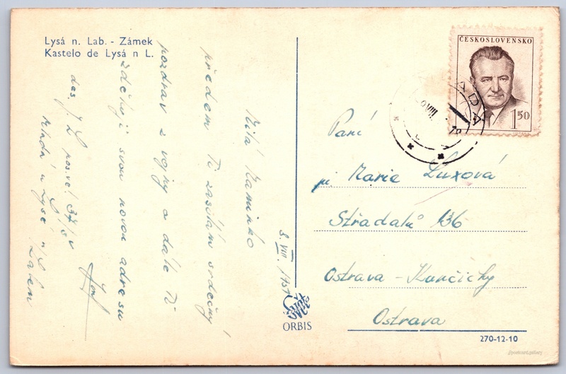 Zámek Lysá nad Labem Pokud chcete vidět pohlednice ve vyšším rozlišení nebo zobrazovat jejich zadní stranu, tak se prosím nejdříve přihlašte Přihlásit Zaregistrovat Lysá n. Lab. - ZámekKastelo de Lysá n L. Jazyky tištěného textu na pohlednici: čeština, esperanto Zámek Lysá nad Labem, Zámek, Zámecká 1/21, Lysá nad Labem, Česko ukázat na mapě V blízkém okolí místa zobrazeného na pohlednici lze najít 1 jinou pohlednici. Zobrazit blízké pohlednice Vydavatel: Nakladatelství Orbis (Československo) Odhadované datum vydání pohlednice: 1948 - 1951 Pomozte nám zpřesnit rok vzniku pohlednice Velikost (š x v) a tvar pohlednice: 138 x 90 mm (5.43" x 3.54"), obdélník Prošlá poštou:Datum na razítku: 8.8.1951Datum napsání pohledu: 8.8.1951 Ceny: Vyplacené známky: 1,50 Kčs (CSK) Kódy na pohlednici: 270-12-10 DiskuseVložit příspěvek Přidat novou složku ... Spravovat složky ...