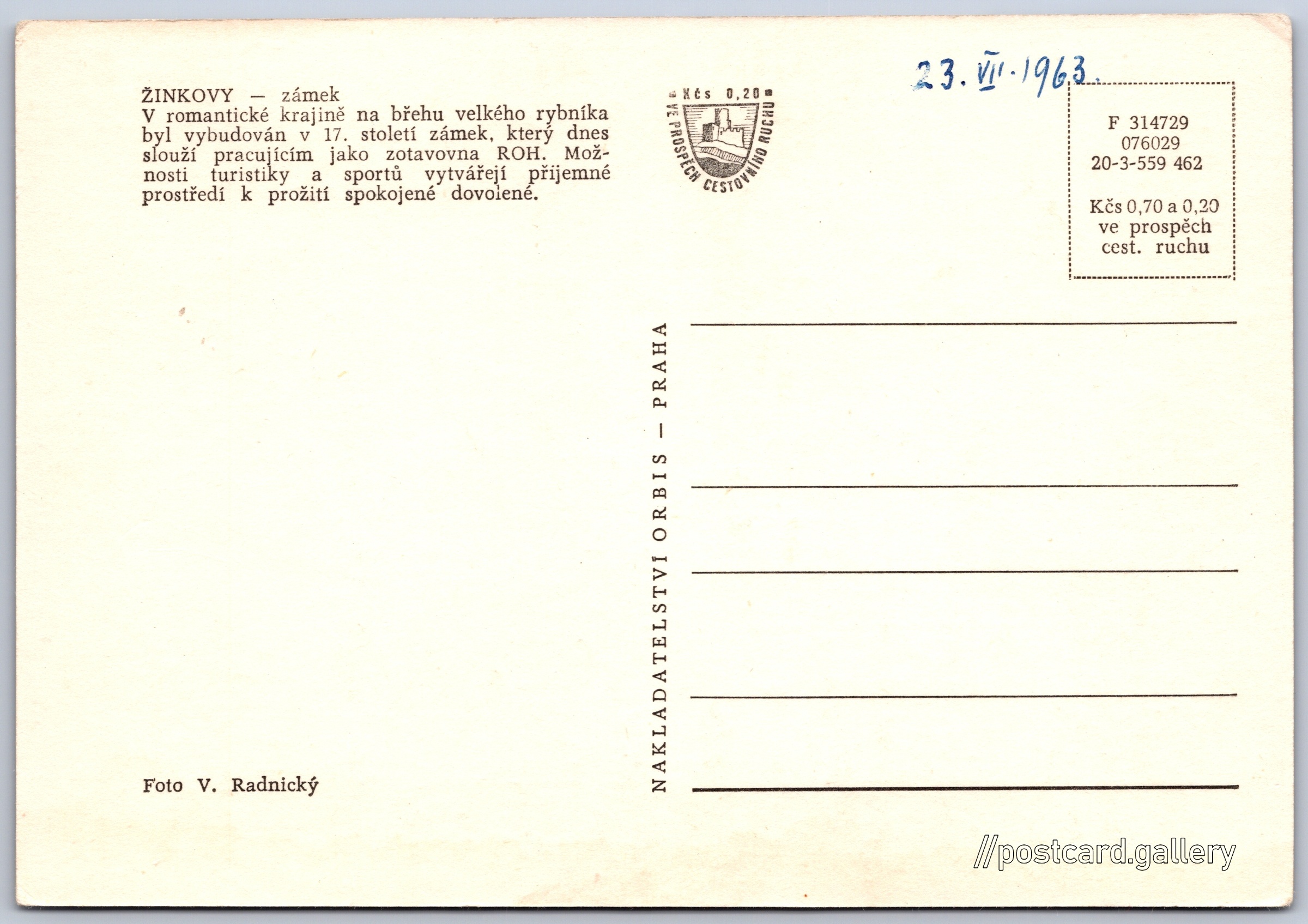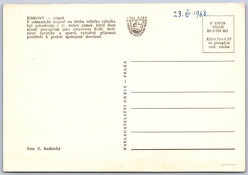 Zámek Žinkovy 2/6 Pokud chcete vidět pohlednice ve vyšším rozlišení nebo zobrazovat jejich zadní stranu, tak se prosím nejdříve přihlašte Přihlásit Zaregistrovat ŽINKOVY - zámekV romantické krajině na břehu velkého rybníka byl vybudován v 17. století zámek, který dnes slouží pracujícím jako zotavovna ROH. Možnosti turistiky a sportů vytvářejí prostředí k prožití spokojené dovolené. Jazyk tištěného textu na pohlednici: čeština Žinkovy, Plzeň-jih ukázat na mapě V blízkém okolí místa zobrazeného na pohlednici lze najít 4 jiné pohlednice. Zobrazit blízké pohlednice Vydavatel: Nakladatelství Orbis (Československo) Rok vydání pohlednice: duben, 1962 Velikost (š x v) a tvar pohlednice: 147 x 102 mm (5.79" x 4.02"), obdélník Osoby spjaté s touto pohlednicí: Viktor Radnický(Autor fotografie) Čistá pohlednice (neprošlá poštou) Ceny: Cena pohlednice: 0,70 Kčs (CSK) (+0,20 Kčs přípl. na tur. ruch) Kódy na pohlednici: F 314729 076029 20-3-559 462 DiskuseVložit příspěvek Přidat novou složku ... Spravovat složky ...