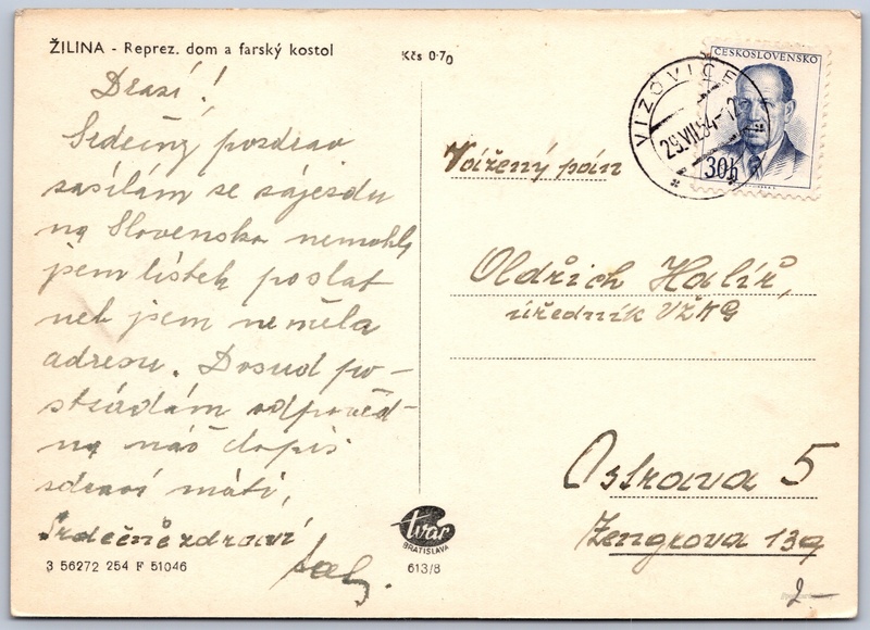 Žilina, farní kostel Pokud chcete vidět pohlednice ve vyšším rozlišení nebo zobrazovat jejich zadní stranu, tak se prosím nejdříve přihlašte Přihlásit Zaregistrovat ŽILINA - Reprez. dom a farský kostol Jazyk tištěného textu na pohlednici: slovenština Ulica J. M. Hurbana 217/1 ukázat na mapě V blízkém okolí místa zobrazeného na pohlednici lze najít 7 jiných pohlednic. Zobrazit blízké pohlednice Vydavatel: Tvar Bratislava (Československo) Rok vydání pohlednice: únor, 1954 Velikost (š x v) a tvar pohlednice: 146 x 105 mm (5.75" x 4.13"), obdélník Prošlá poštou:Datum na razítku: 29.7.1954 Ceny: Cena pohlednice: 0,70 Kčs (CSK)Vyplacené známky: 0,30 Kčs (CSK) Kódy na pohlednici: 3 56272 254 F 51046 613/8 DiskuseVložit příspěvek Přidat novou složku ... Spravovat složky ...