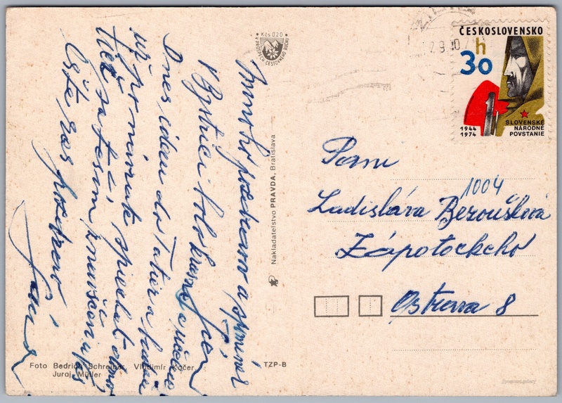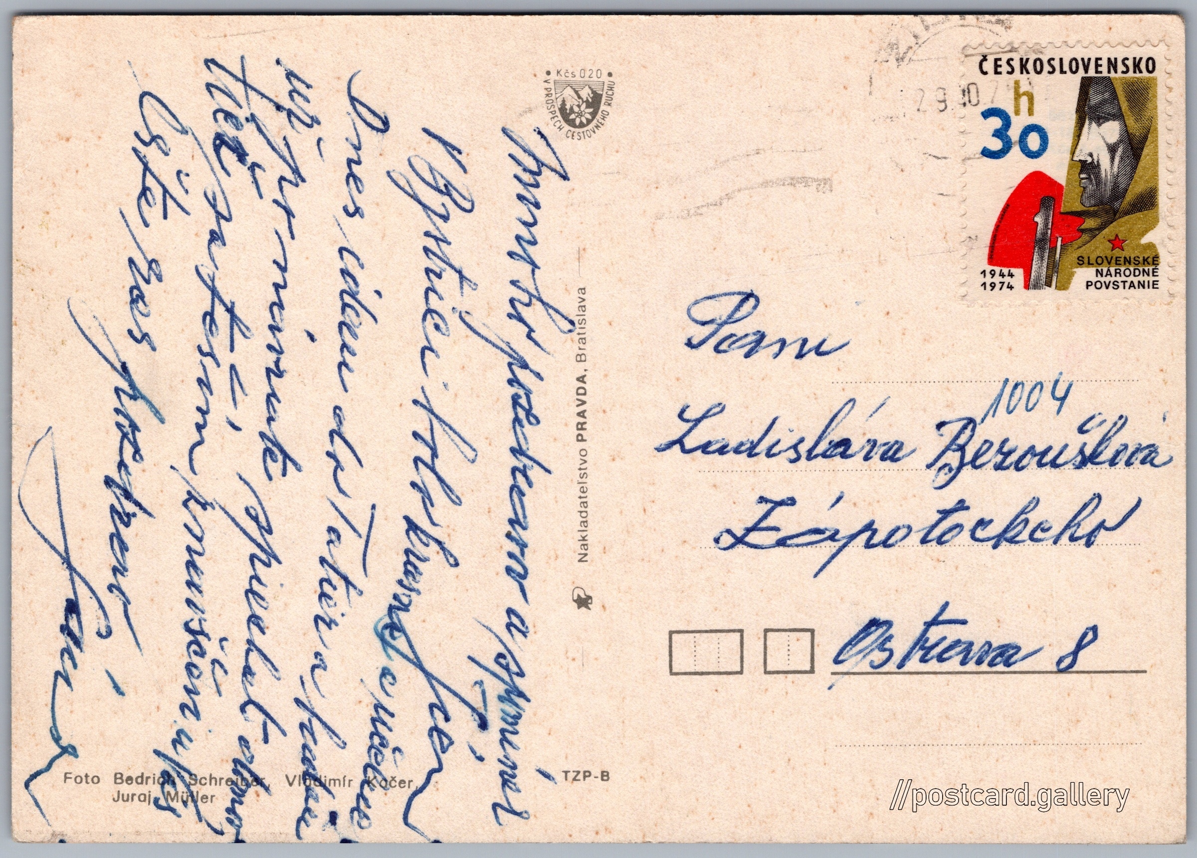 Žilina 2/8 Pokud chcete vidět pohlednice ve vyšším rozlišení nebo zobrazovat jejich zadní stranu, tak se prosím nejdříve přihlašte Přihlásit Zaregistrovat Žilina Jazyk tištěného textu na pohlednici: slovenština Žilina, Město, Slovensko ukázat na mapě V blízkém okolí místa zobrazeného na pohlednici lze najít 7 jiných pohlednic. Zobrazit blízké pohlednice Vydavatel: Nakladateľstvo PRAVDA, Bratislava (Československo) Odhadované datum vydání pohlednice: 1972 - 1975 Pomozte nám zpřesnit rok vzniku pohlednice Velikost (š x v) a tvar pohlednice: 149 x 106 mm (5.87" x 4.17"), obdélník Osoby spjaté s touto pohlednicí: Vladimír Kačer(Autor fotografie) Juraj Müller(Autor fotografie) Bedrich Schreiber(Autor fotografie) Prošlá poštou:Datum na razítku: 29.10.1975 Ceny: Příplatek na tur. ruch: 0,20 Kčs (CSK))Vyplacené známky: 0,30 Kčs (CSK) DiskuseVložit příspěvek Přidat novou složku ... Spravovat složky ...