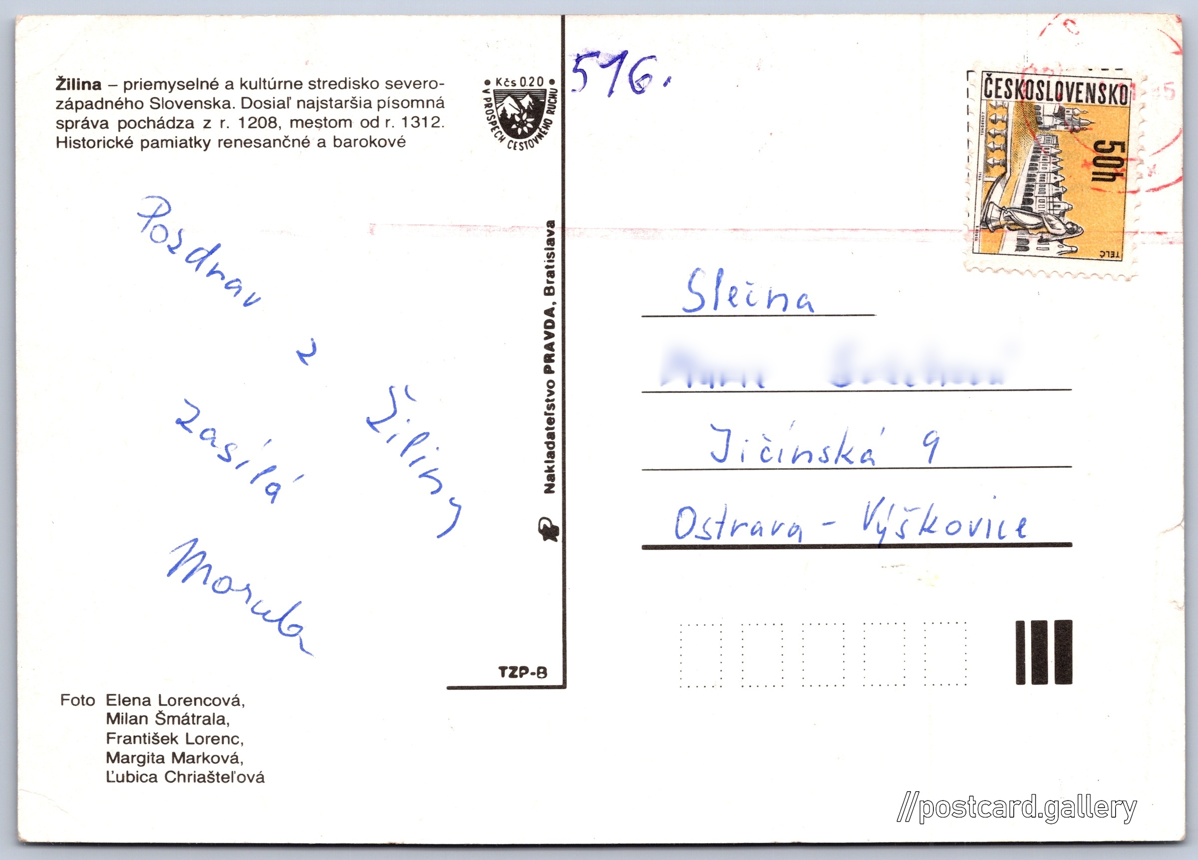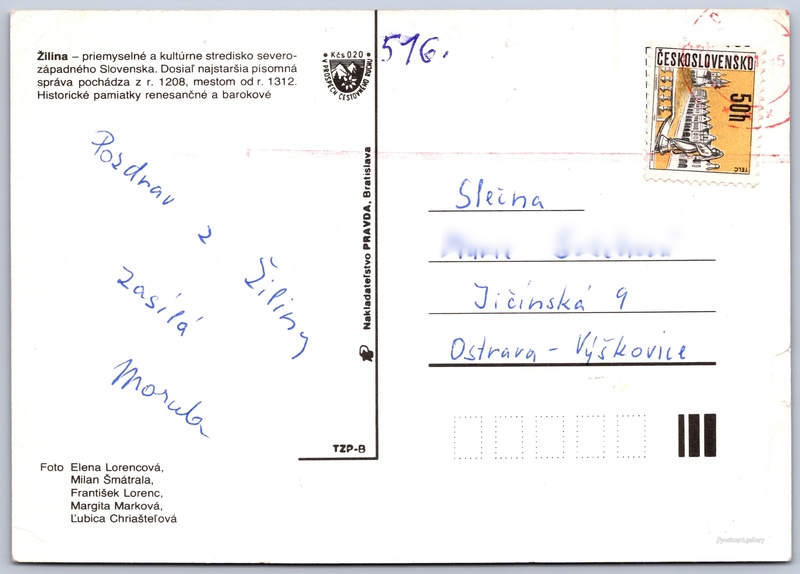 Žilina Pokud chcete vidět pohlednice ve vyšším rozlišení nebo zobrazovat jejich zadní stranu, tak se prosím nejdříve přihlašte Přihlásit Zaregistrovat Žilina Žilina - priemyselné a kultúrne stredisko severozápadného Slovenska. Dosiaľ najstaršia písomná správa pochádza z r. 1208, mestom od r. 1312. Historické pamiatky renesančné a barokové Jazyk tištěného textu na pohlednici: slovenština Mariánske námestie 195/10 ukázat na mapě Vydavatel: Nakladateľstvo PRAVDA, Bratislava (Československo) Datum vydání není známo Pomozte nám odhadnout datum vzniku pohlednice Velikost (š x v) a tvar pohlednice: 147 x 106 mm (5.79" x 4.17"), obdélník Osoby spjaté s touto pohlednicí: Elena Lorencová(Autor fotografie) Margita Marková(Autor fotografie) František Lorenc(Autor fotografie) Milan Šmátrala(Autor fotografie) Ľubica Chriašteľová(Autor fotografie) Prošlá poštou Ceny: Příplatek na tur. ruch: 0,20 Kčs (CSK))Vyplacené známky: 0,50 Kčs (CSK) DiskuseVložit příspěvek Přidat novou složku ... Spravovat složky ...