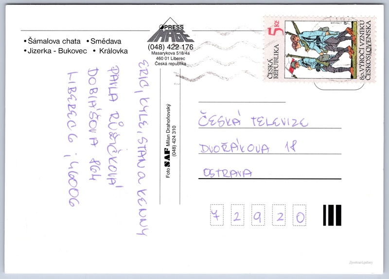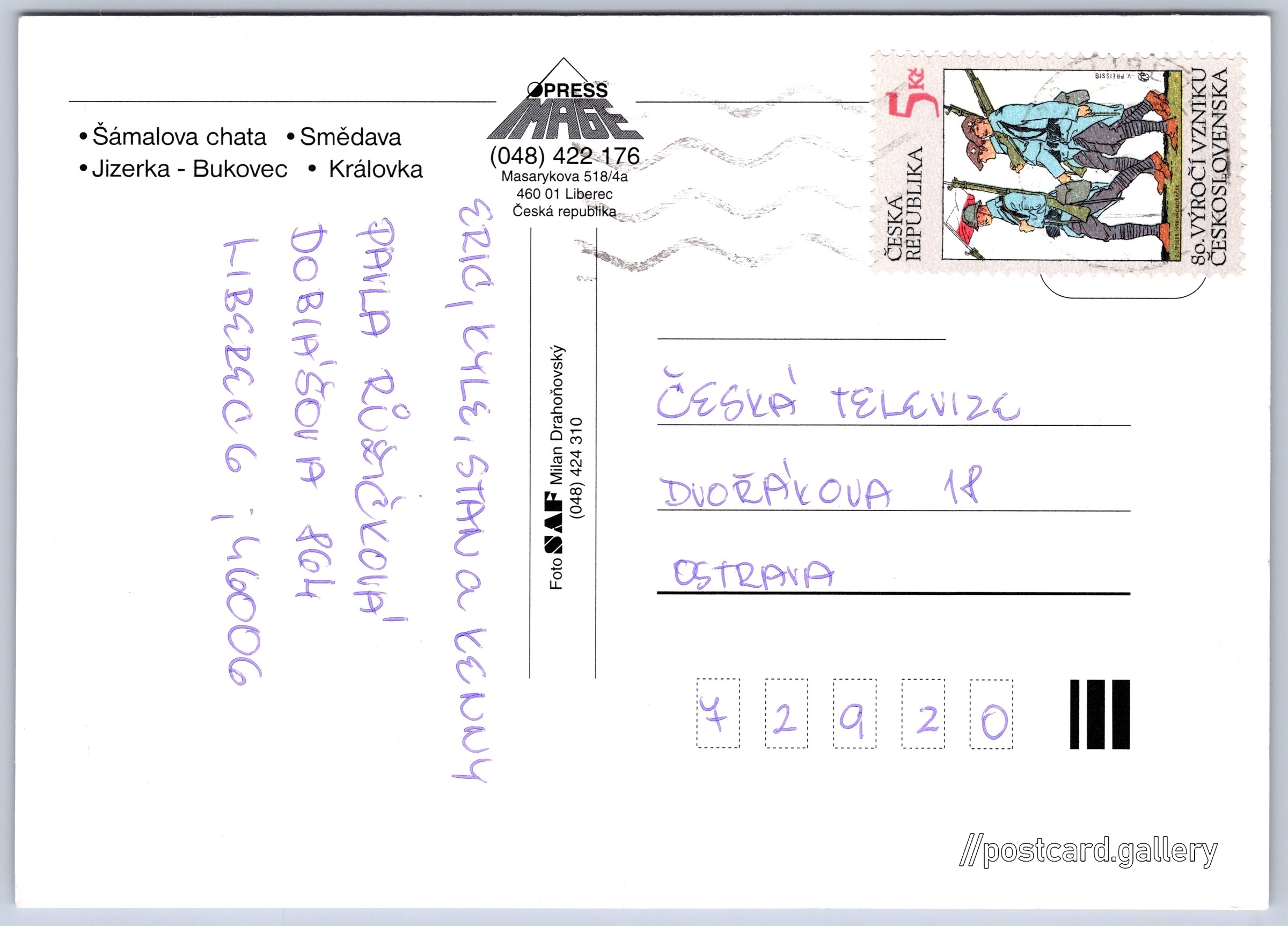Zima v Jizerských horách 1/3 Pokud chcete vidět pohlednice ve vyšším rozlišení nebo zobrazovat jejich zadní stranu, tak se prosím nejdříve přihlašte Přihlásit Zaregistrovat Zima v Jizerských horách - Šámalova chata- Smědava- Jizerka - Bukovec- Královka Jazyk tištěného textu na pohlednici: čeština Smědava, Místní název, osada, Bílý Potok, Česko ukázat na mapě V blízkém okolí místa zobrazeného na pohlednici lze najít 3 jiné pohlednice. Zobrazit blízké pohlednice Vydavatel: Press Image (Česko) Odhadované datum vydání pohlednice: 1997 - 2000 Pomozte nám zpřesnit rok vzniku pohlednice Velikost (š x v) a tvar pohlednice: 147 x 105 mm (5.79" x 4.13"), obdélník Osoby spjaté s touto pohlednicí: Milan Drahoňovský(Autor fotografie) Prošlá poštou Ceny: Vyplacené známky: 5,00 Kč (CZK) DiskuseVložit příspěvek Přidat novou složku ... Spravovat složky ...