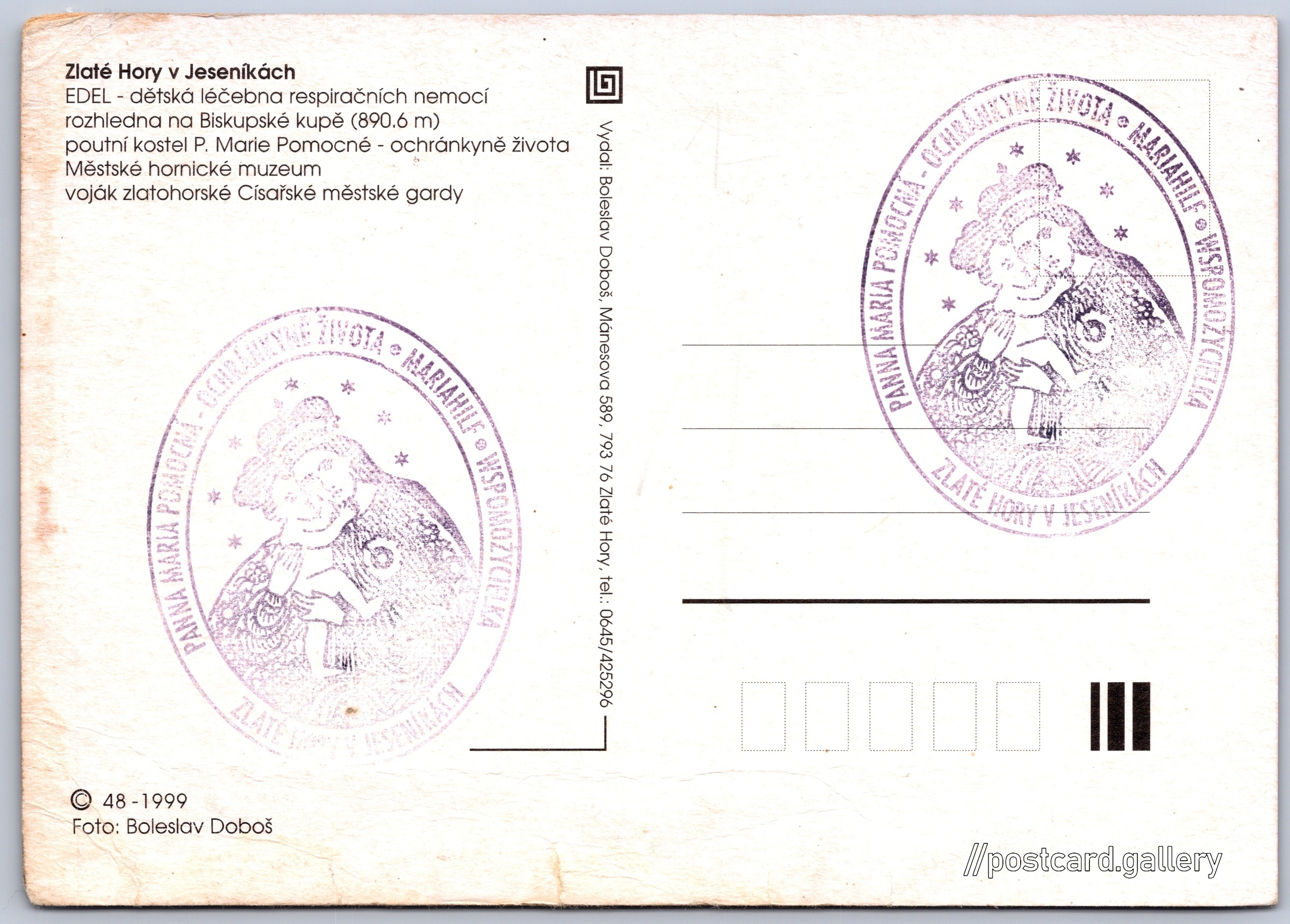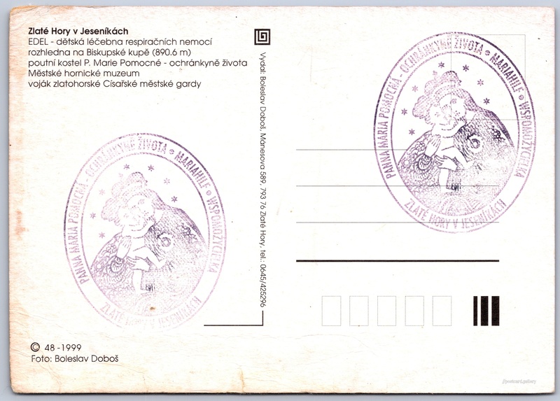 Zlaté Hory Pokud chcete vidět pohlednice ve vyšším rozlišení nebo zobrazovat jejich zadní stranu, tak se prosím nejdříve přihlašte Přihlásit Zaregistrovat Zlaté Hory Zlaté Hory v Jeseníkách- EDEL - dětská léčebna respiračních nemocí- rozhledna na Biskupské kupě (890.6 m)- poutní kostel P. Marie Pomocné - ochránkyně života- Městské hornické muzeum- voják zlatohorské Císařské městské gardy Jazyk tištěného textu na pohlednici: čeština SANATORIUM EDEL s.r.o., Lázeňská 491, Zlaté Hory, Česko ukázat na mapě Vydavatel: Boleslav Doboš (Česko) Rok vydání pohlednice: 1999 Velikost (š x v) a tvar pohlednice: 148 x 105 mm (5.83" x 4.13"), obdélník Osoby spjaté s touto pohlednicí: Boleslav Doboš(Autor fotografie) Čistá pohlednice (neprošlá poštou) Kódy na pohlednici: 48-1999 DiskuseVložit příspěvek Přidat novou složku ... Spravovat složky ...