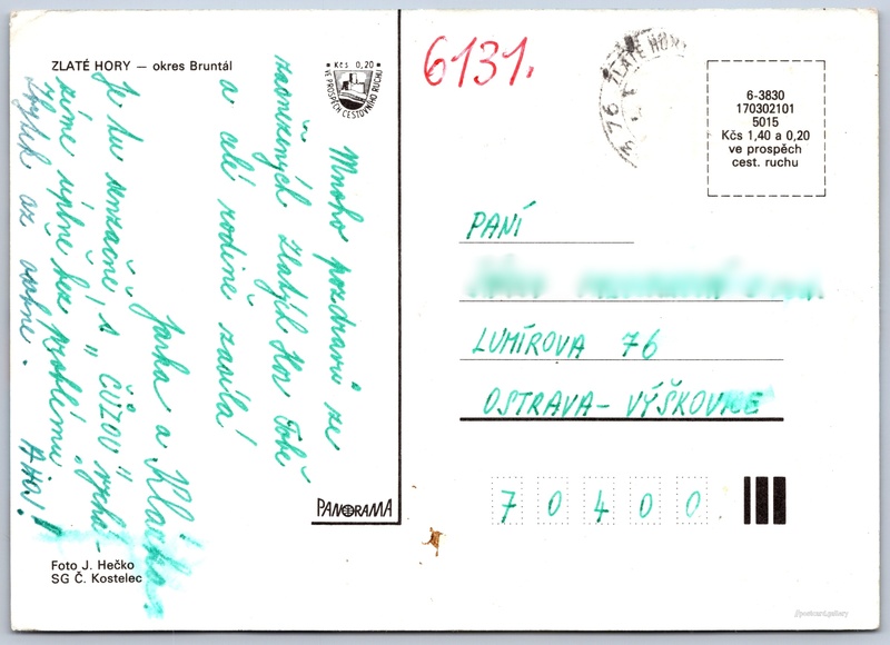 Zlaté Hory Pokud chcete vidět pohlednice ve vyšším rozlišení nebo zobrazovat jejich zadní stranu, tak se prosím nejdříve přihlašte Přihlásit Zaregistrovat Zlaté Hory ZLATÉ HORYokres Bruntál Jazyk tištěného textu na pohlednici: čeština nám. Svobody 95, Zlaté Hory, 793 76, Jeseník ukázat na mapě Vydavatel: Panorama (Československo) Datum vydání není známo Pomozte nám odhadnout datum vzniku pohlednice Velikost (š x v) a tvar pohlednice: 148 x 106 mm (5.83" x 4.17"), obdélník Osoby spjaté s touto pohlednicí: J. Hečko(Autor fotografie) Prošlá poštou Ceny: Cena pohlednice: 1,40 Kčs (CSK) (+0,20 Kčs přípl. na tur. ruch) Kódy na pohlednici: 6-3830 170302101 5015 DiskuseVložit příspěvek Přidat novou složku ... Spravovat složky ...