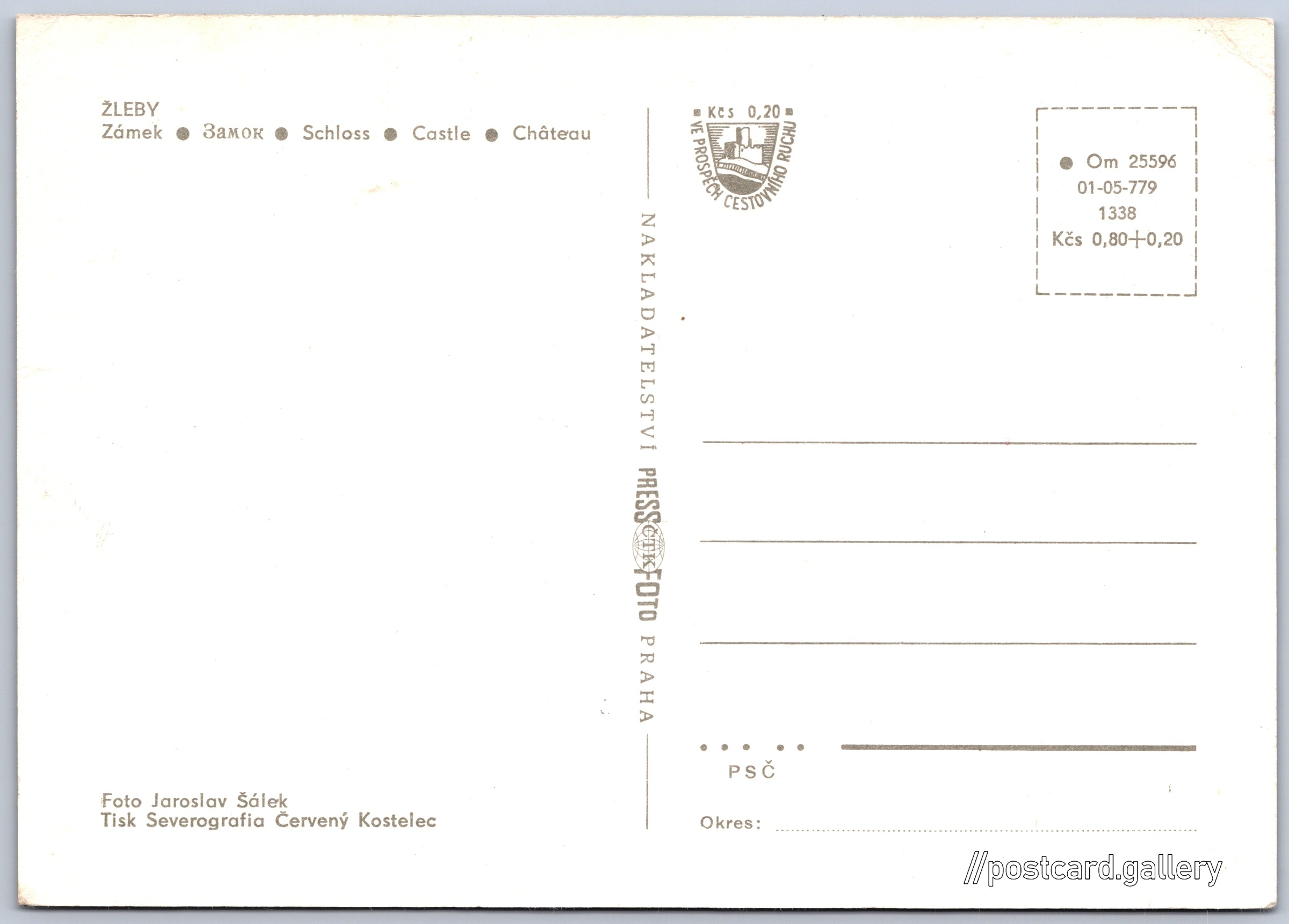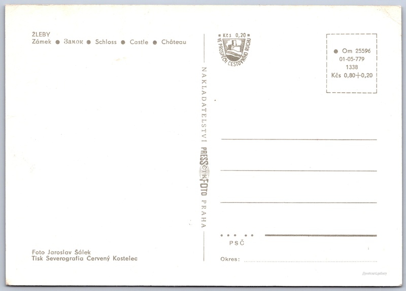Žleby, zámek Pokud chcete vidět pohlednice ve vyšším rozlišení nebo zobrazovat jejich zadní stranu, tak se prosím nejdříve přihlašte Přihlásit Zaregistrovat ŽLEBY- Zámek- Замок- Schloss- Castle- Château Jazyky tištěného textu na pohlednici: čeština, ruština, němčina, angličtina, francouzština, francouzština Žleby, Kutná Hora ukázat na mapě V blízkém okolí místa zobrazeného na pohlednici lze najít 3 jiné pohlednice. Zobrazit blízké pohlednice Vydavatel: PressFoto Praha (Československo) Rok vydání pohlednice: 1977 Velikost (š x v) a tvar pohlednice: 148 x 105 mm (5.83" x 4.13"), obdélník Osoby spjaté s touto pohlednicí: Jaroslav Šálek(Autor fotografie) Čistá pohlednice (neprošlá poštou) Ceny: Cena pohlednice: 0,80 Kčs (CSK) (+0,20 Kčs přípl. na tur. ruch) Kódy na pohlednici: •Om 25596 01-05-779 1338 DiskuseVložit příspěvek Přidat novou složku ... Spravovat složky ...