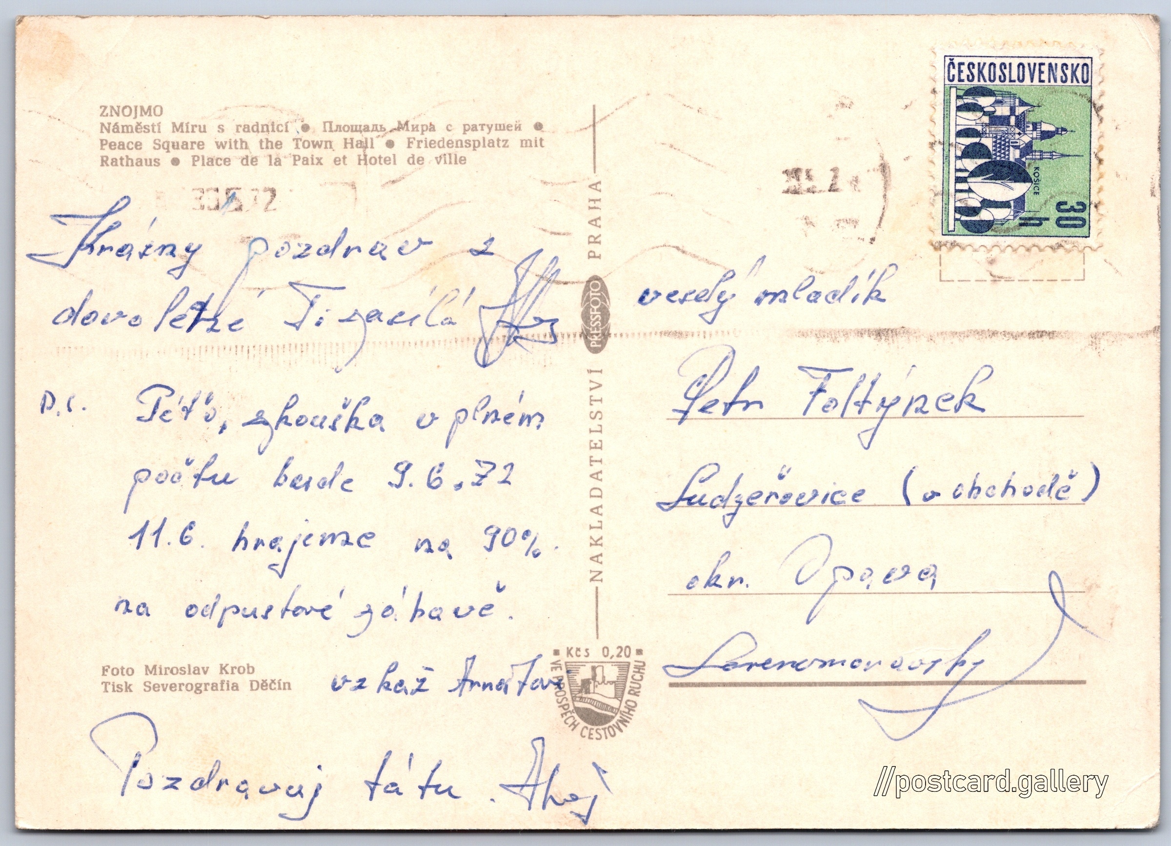 Znojmo, náměstí míru Pokud chcete vidět pohlednice ve vyšším rozlišení nebo zobrazovat jejich zadní stranu, tak se prosím nejdříve přihlašte Přihlásit Zaregistrovat ZNOJMO- Náměstí Míru s radnici- Площадь Мира с ратушей- Peace Square with the Town Hall- Friedensplatz mit Rathaus- Place de la Paix et Hotel de ville Jazyk tištěného textu na pohlednici: čeština Masarykovo náměstí, Znojmo, Znojmo ukázat na mapě V blízkém okolí místa zobrazeného na pohlednici lze najít 5 jiných pohlednic. Zobrazit blízké pohlednice Vydavatel: PressFoto Praha (Československo) Odhadované datum vydání pohlednice: 1969 - 1972 Pomozte nám zpřesnit rok vzniku pohlednice Velikost (š x v) a tvar pohlednice: 148 x 105 mm (5.83" x 4.13"), obdélník Osoby spjaté s touto pohlednicí: Miroslav Krob(Autor fotografie) Prošlá poštou:Datum na razítku: 30.5.1972 Ceny: Příplatek na tur. ruch: 0,20 Kčs (CSK))Vyplacené známky: 0,30 Kčs (CSK) DiskuseVložit příspěvek Přidat novou složku ... Spravovat složky ...