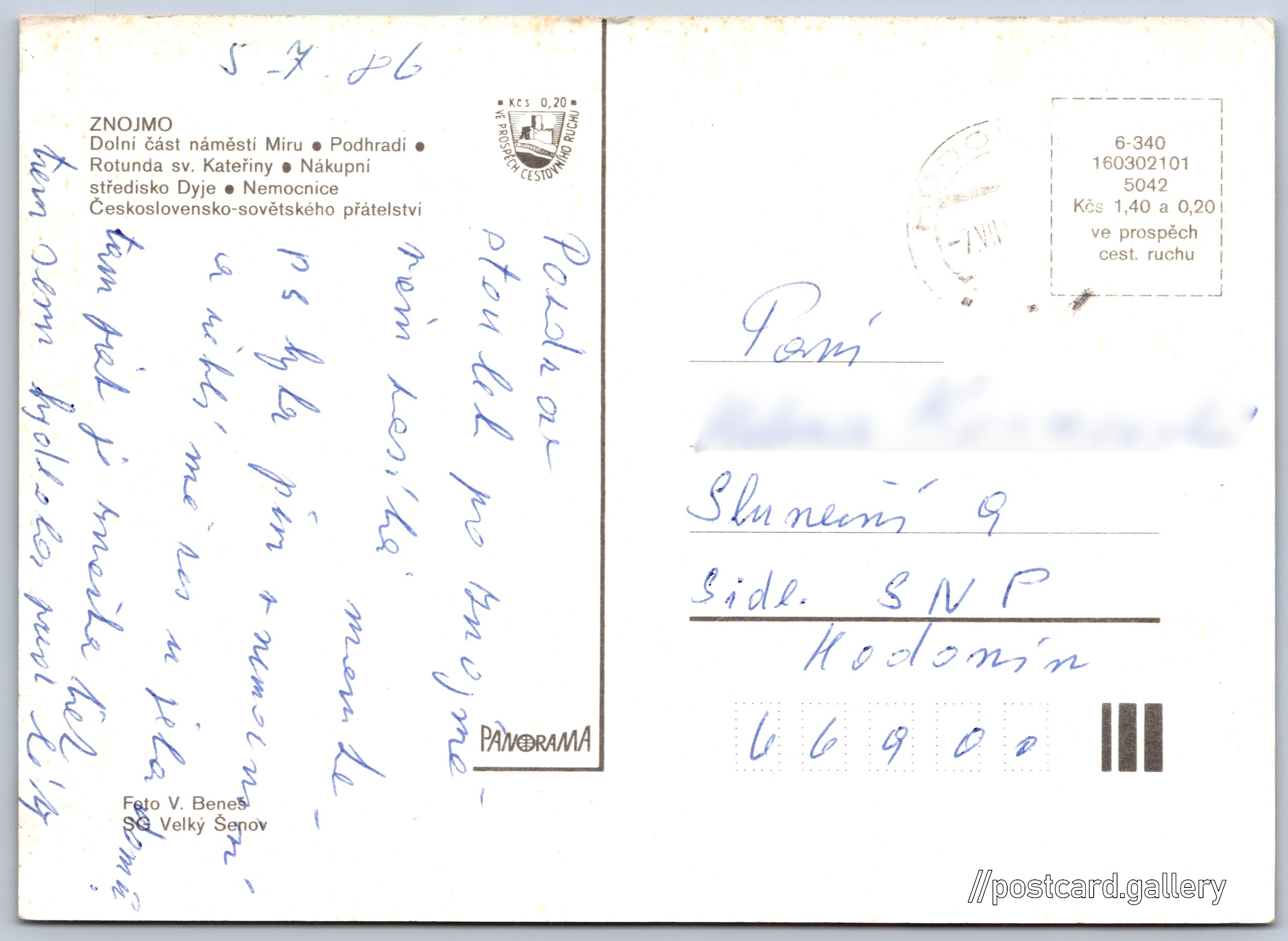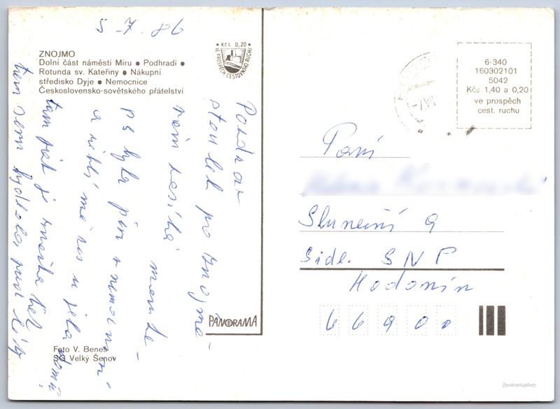 Znojmo Pokud chcete vidět pohlednice ve vyšším rozlišení nebo zobrazovat jejich zadní stranu, tak se prosím nejdříve přihlašte Přihlásit Zaregistrovat Znojmo ZNOJMO- Dolní část náměstí Míru- Podhradí- Rotunda sv. Kateřiny- Nákupní středisko Dyje- Nemocnice Československo-sovětského přátelství Jazyk tištěného textu na pohlednici: čeština Znojmo, Znojmo ukázat na mapě Vydavatel: Panorama (Československo) Datum vydání není známo Pomozte nám odhadnout datum vzniku pohlednice Velikost (š x v) a tvar pohlednice: 147 x 106 mm (5.79" x 4.17"), obdélník Osoby spjaté s touto pohlednicí: V. Beneš(Autor fotografie) Prošlá poštou Ceny: Cena pohlednice: 1,40 Kčs (CSK) (+0,20 Kčs přípl. na tur. ruch) Kódy na pohlednici: 6-340 160302101 5042 DiskuseVložit příspěvek Přidat novou složku ... Spravovat složky ...